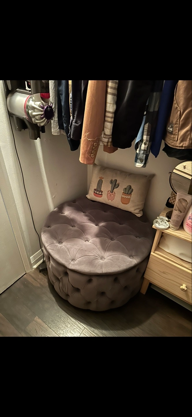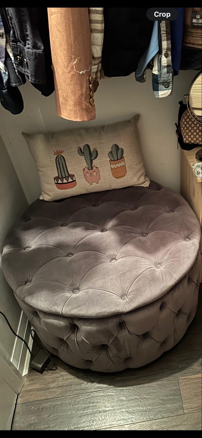 Dark grey round ottoman. Velvet upholstery. Button tufting. Compact size. Perfect for extra seating