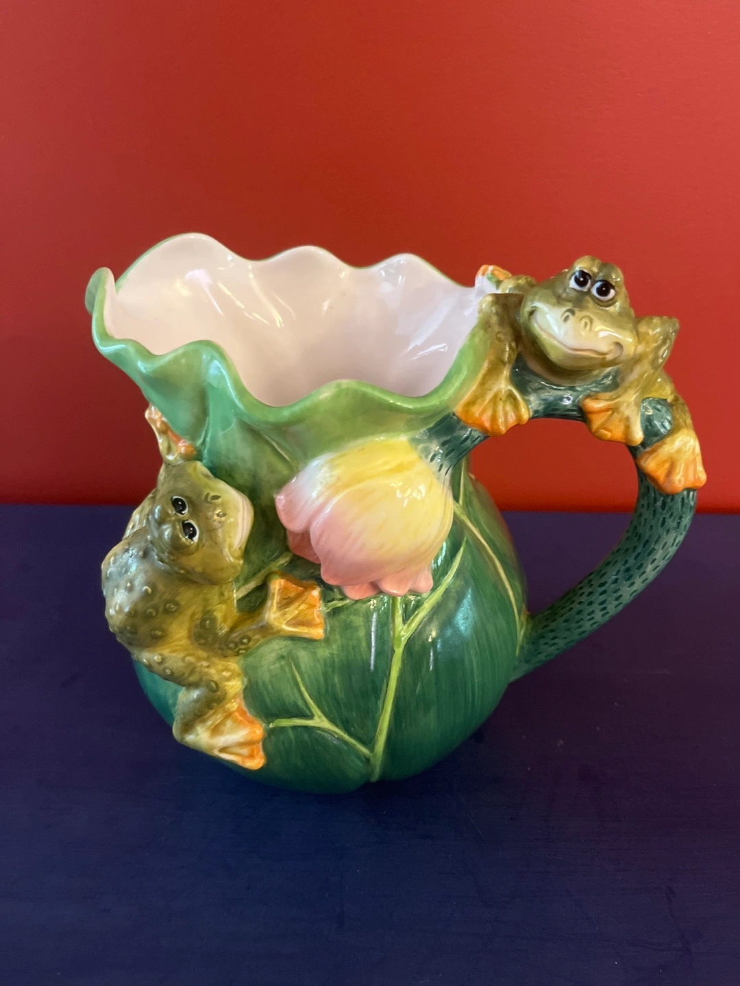 Charming ceramic pitcher. Features two frogs and a lotus flower. Green and pink colours. Perfect for adding a whimsical touch to your kitchen.