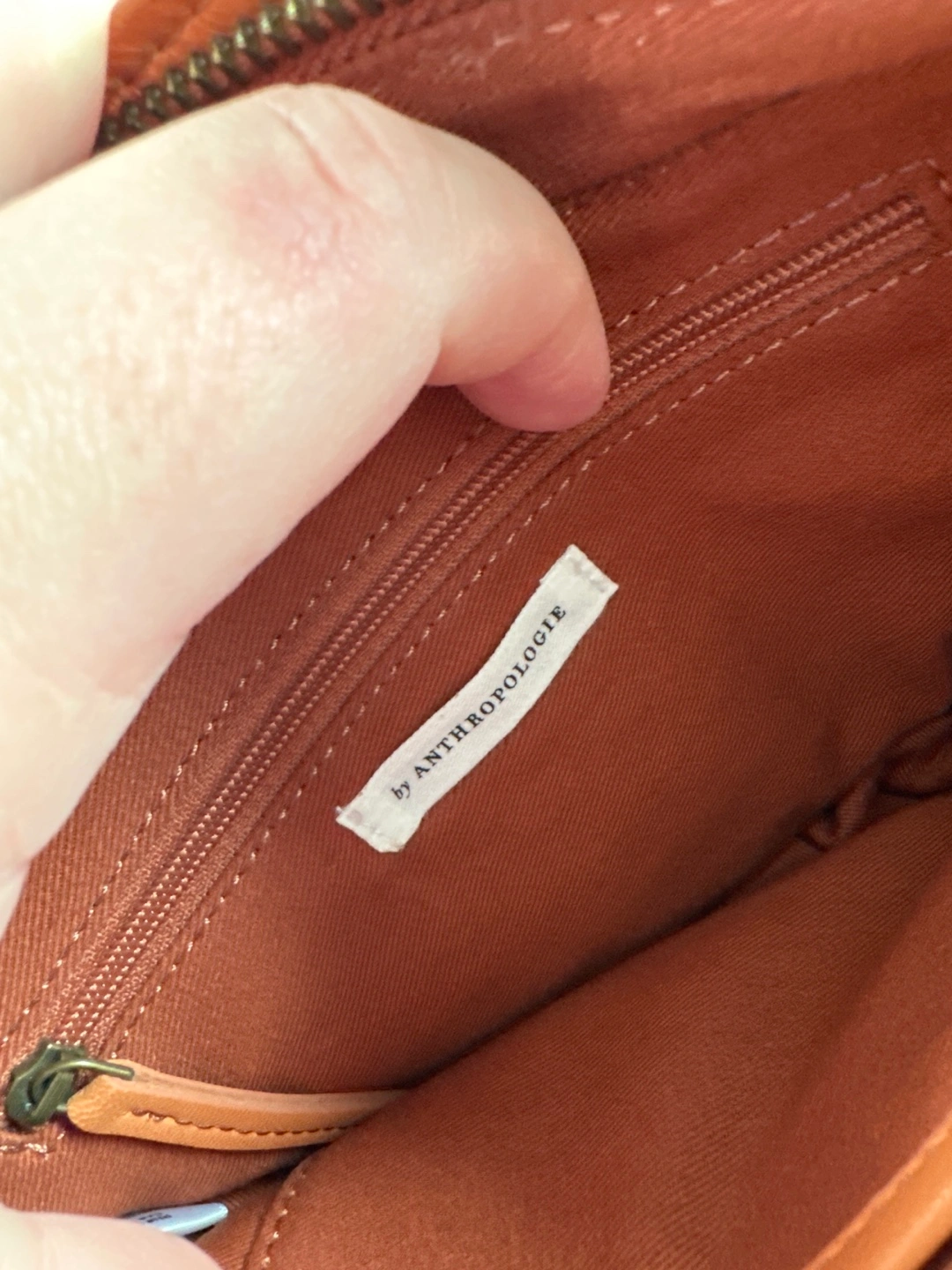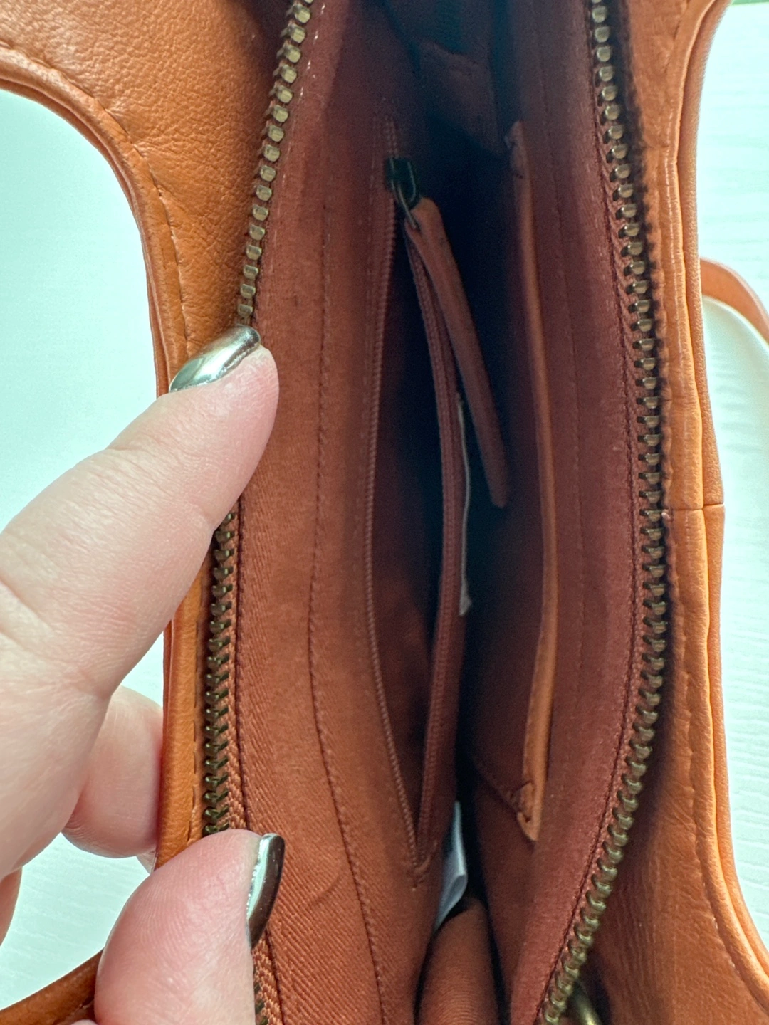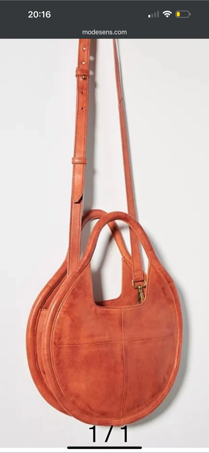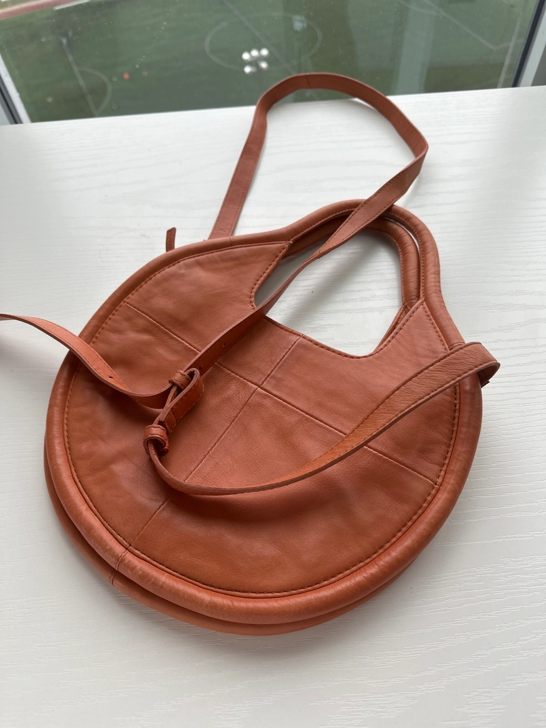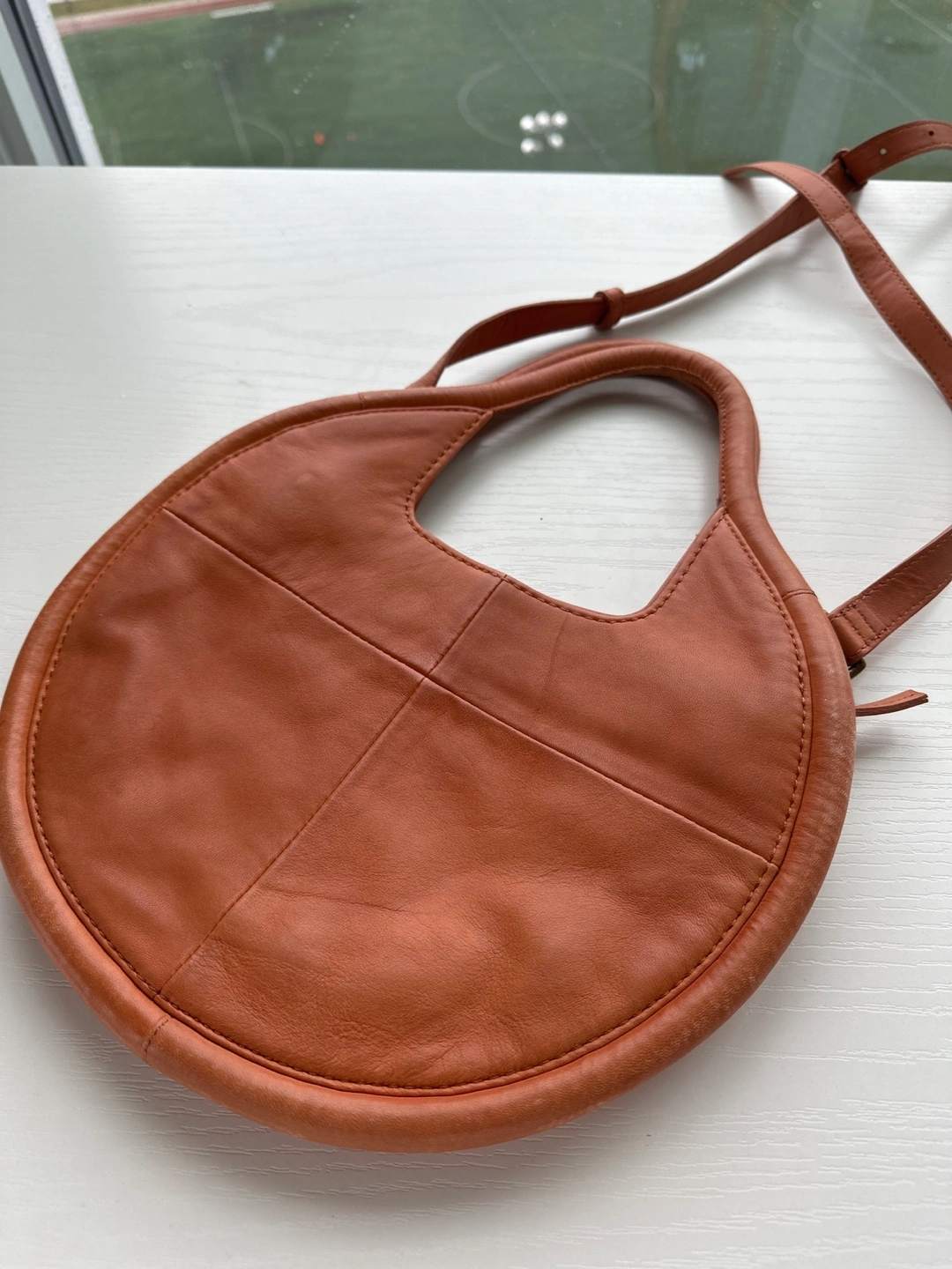 Brown leather handbag. Features a circular shape, adjustable strap, and top handle. Interior zipper pocket. Zipper closure.