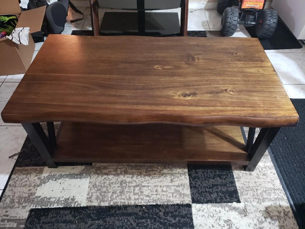 Wooden coffee table with 2 matching end tables. All three have small chips on the corners and one of the end tables has some water stains but otherwise in great condition. Looking for 75 but willing to negotiate.
