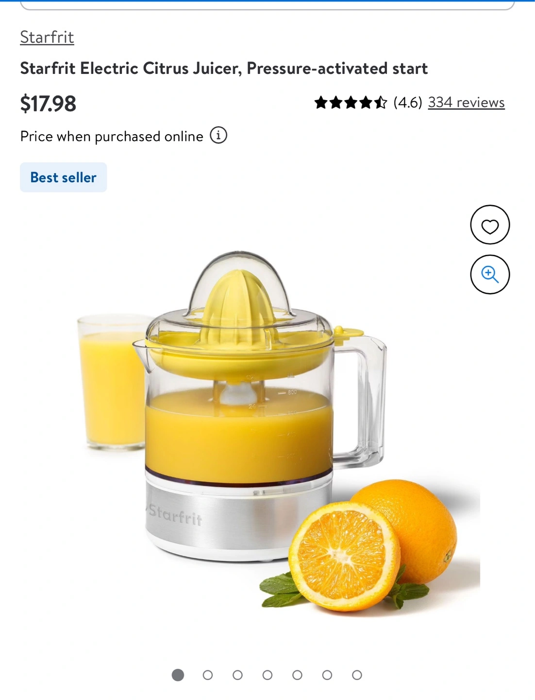 Electric citrus juicer. Pressure-activated start. Makes fresh juice quickly. Includes a transparent jug and yellow reamer.