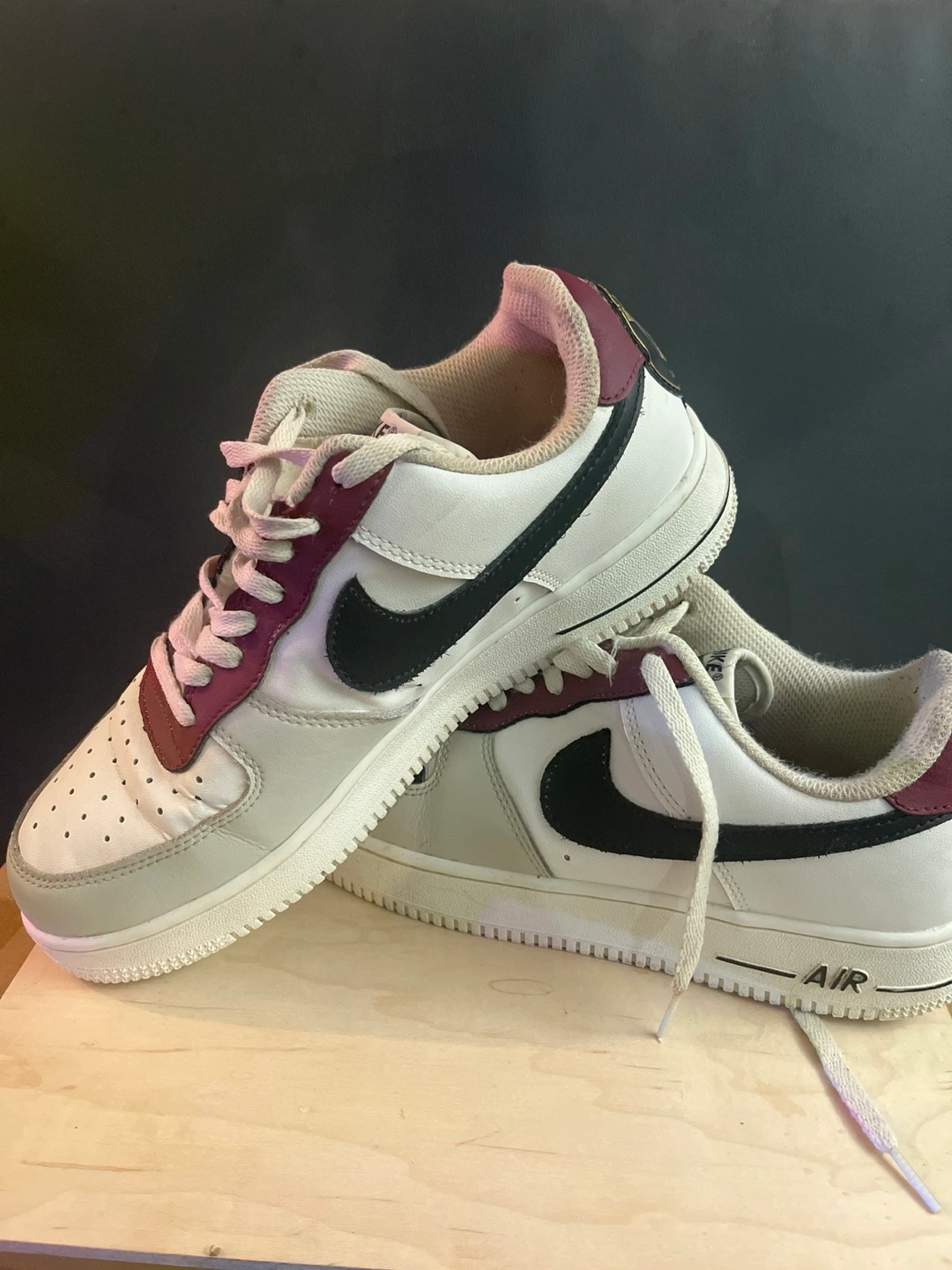 Nike Air Force 1 sneakers. White leather upper. Burgundy accents. Paris Saint-Germain logo on heel. Classic design. Pre-owned.