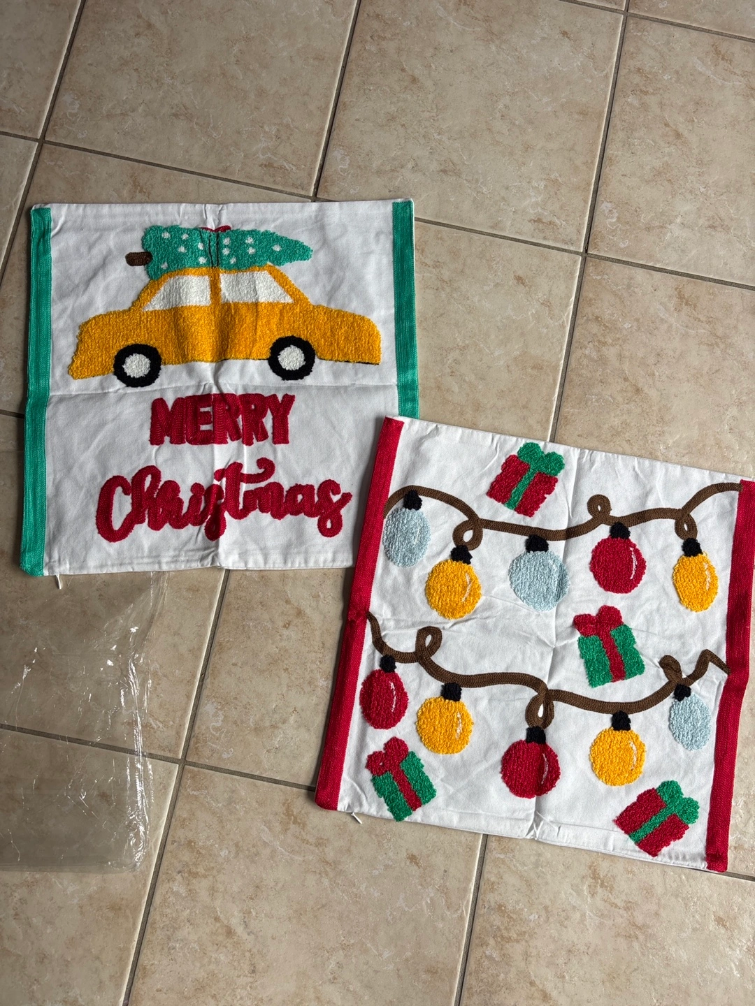 Pair of Christmas-themed throw pillows. Features festive designs. New without tags. Soft and cozy.