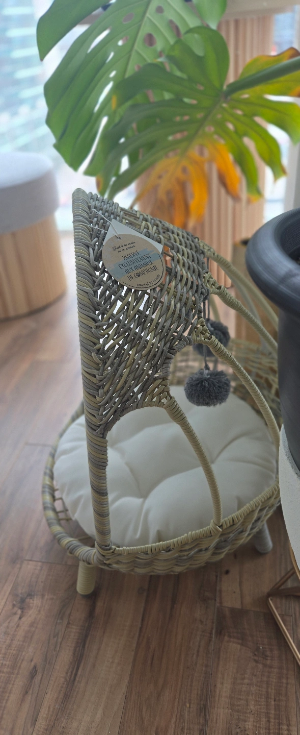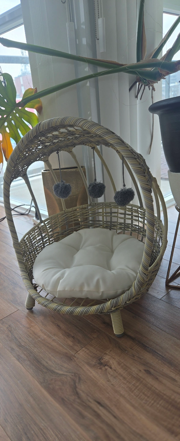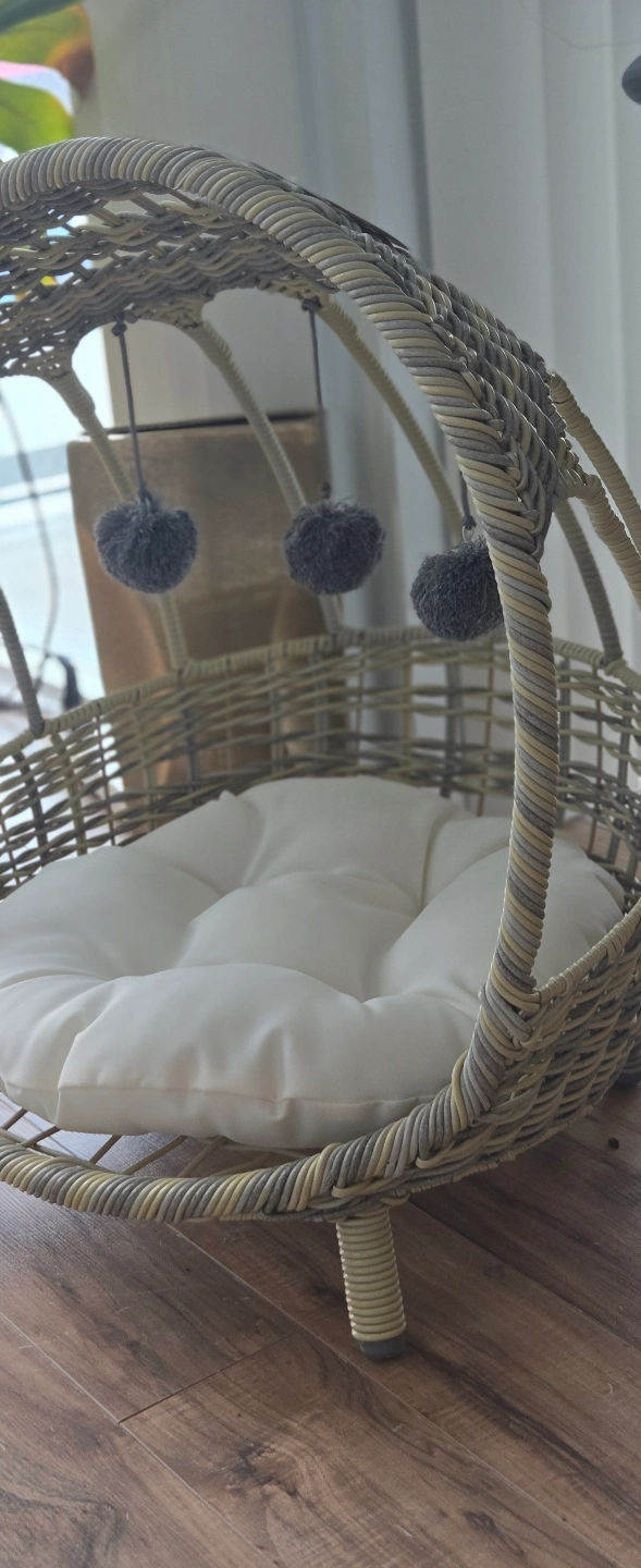 Brand New ans unused with tag. Adorable pet bed. Wicker construction. Features a soft cushion and hanging pom-poms. Unique design.