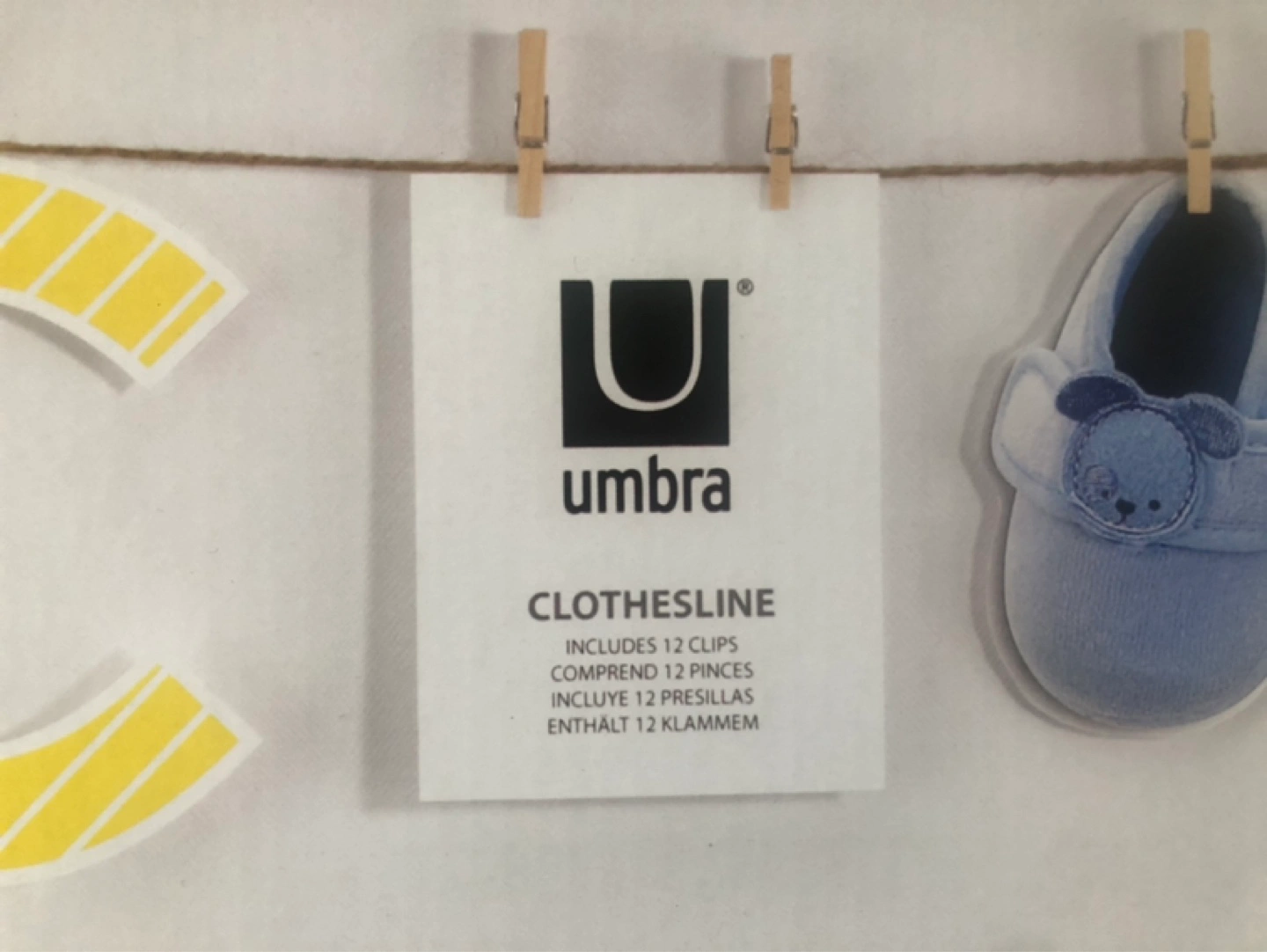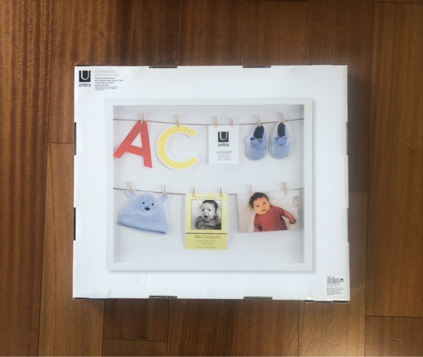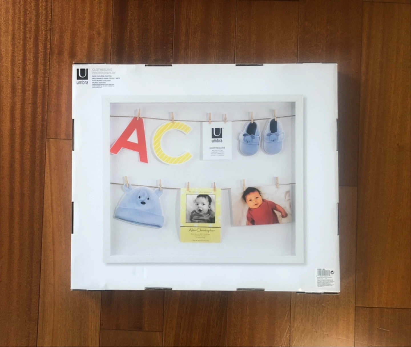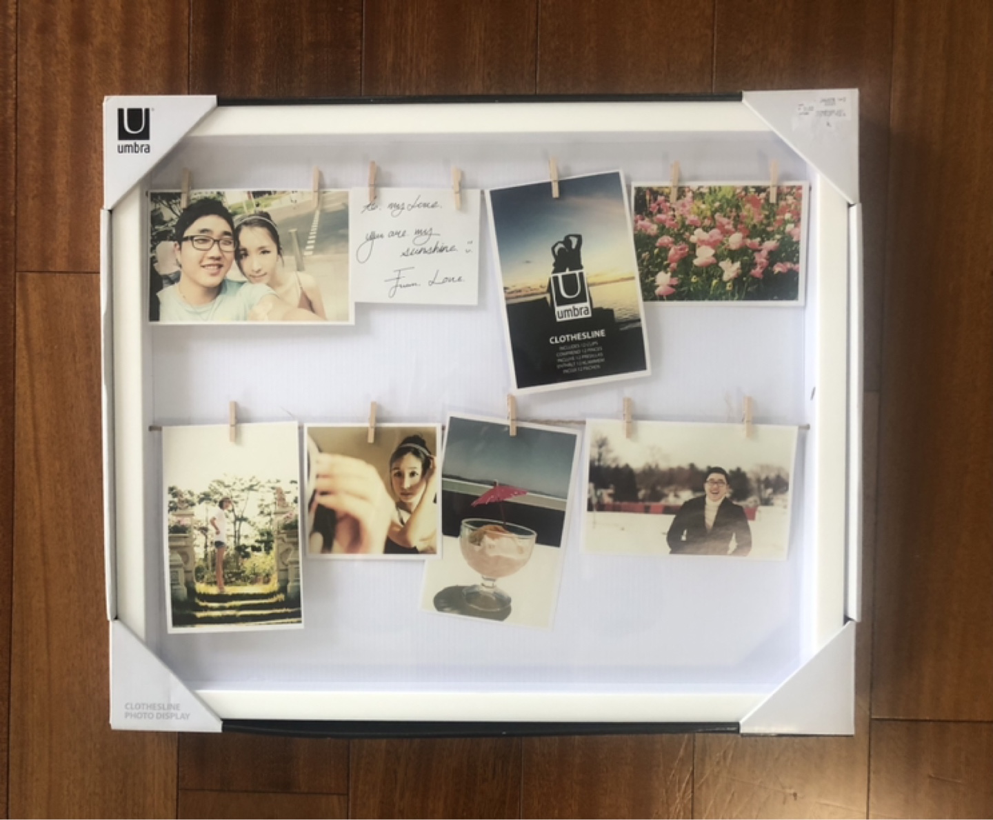 White frame, twelve mini wooden pegs, string. Perfect for photos, mementos. New in box.