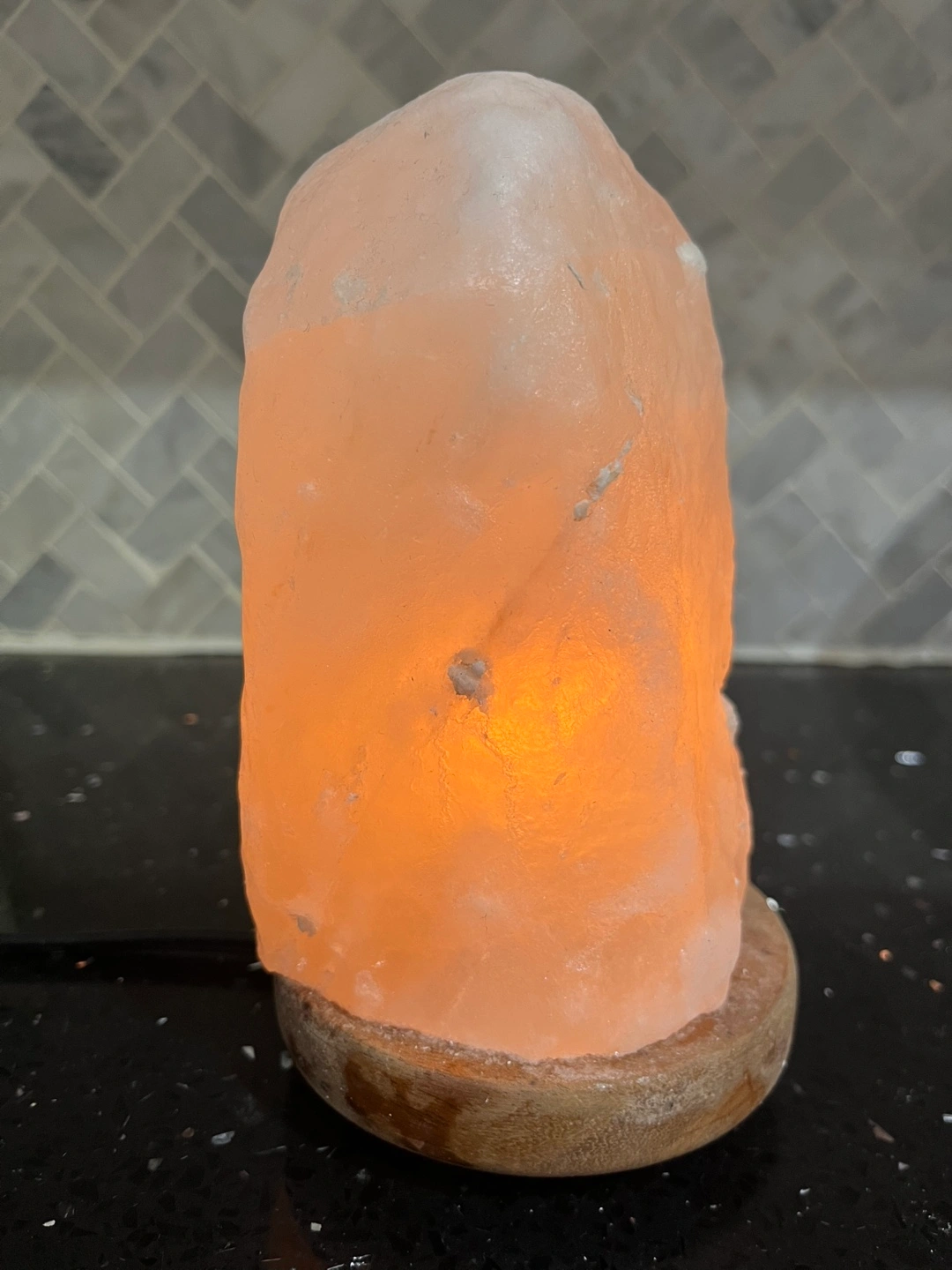 Beautiful, natural Himalayan salt lamp. Unique shape, wooden base. Creates a warm, ambient glow. Perfect bedside lamp or decorative accent. Local pick up and cash payment only