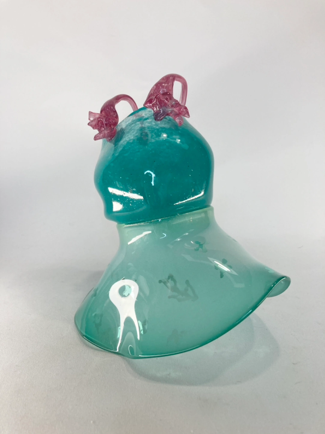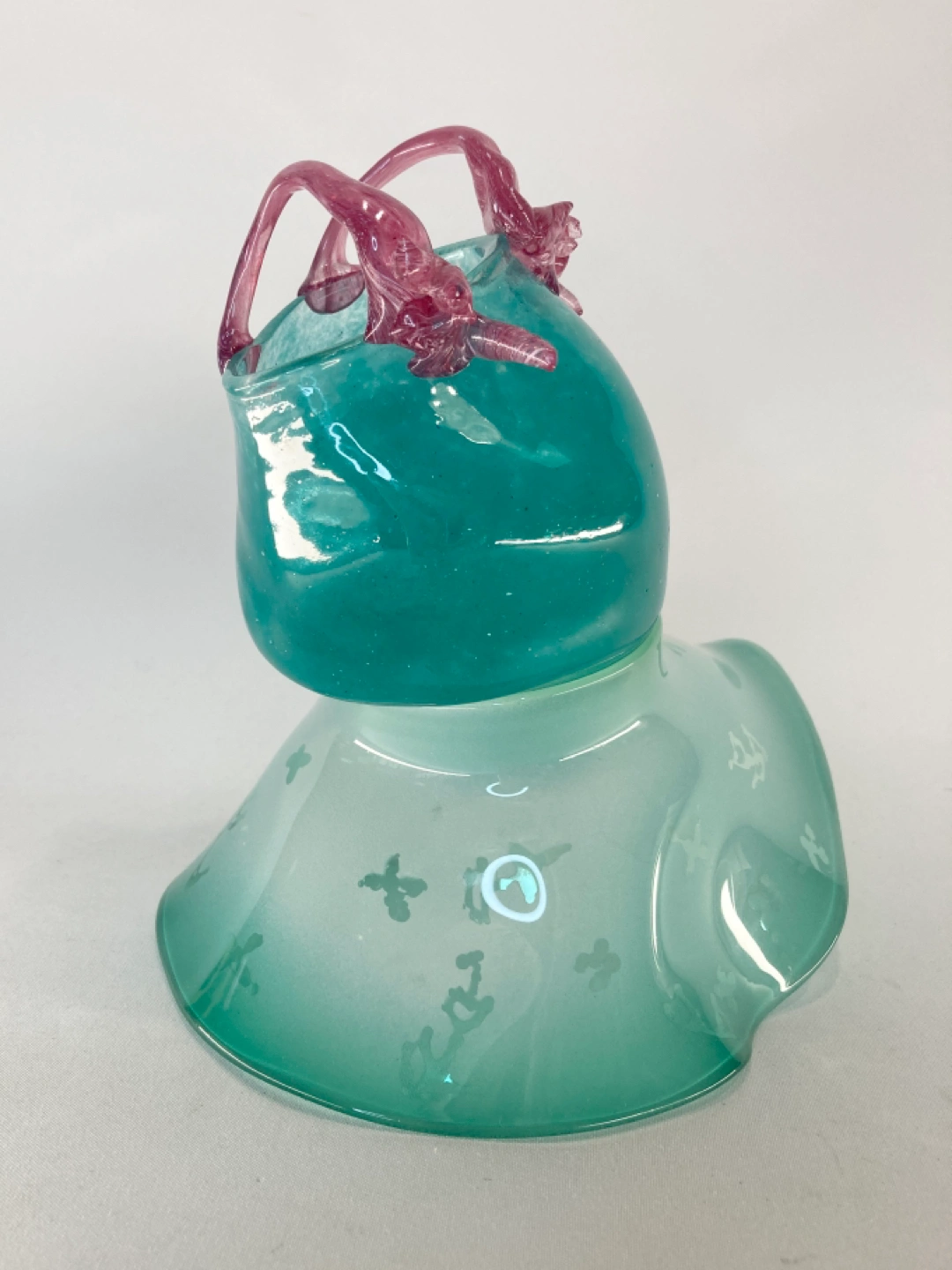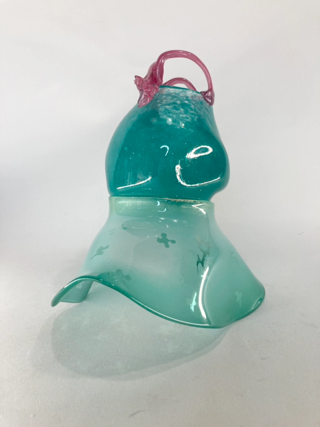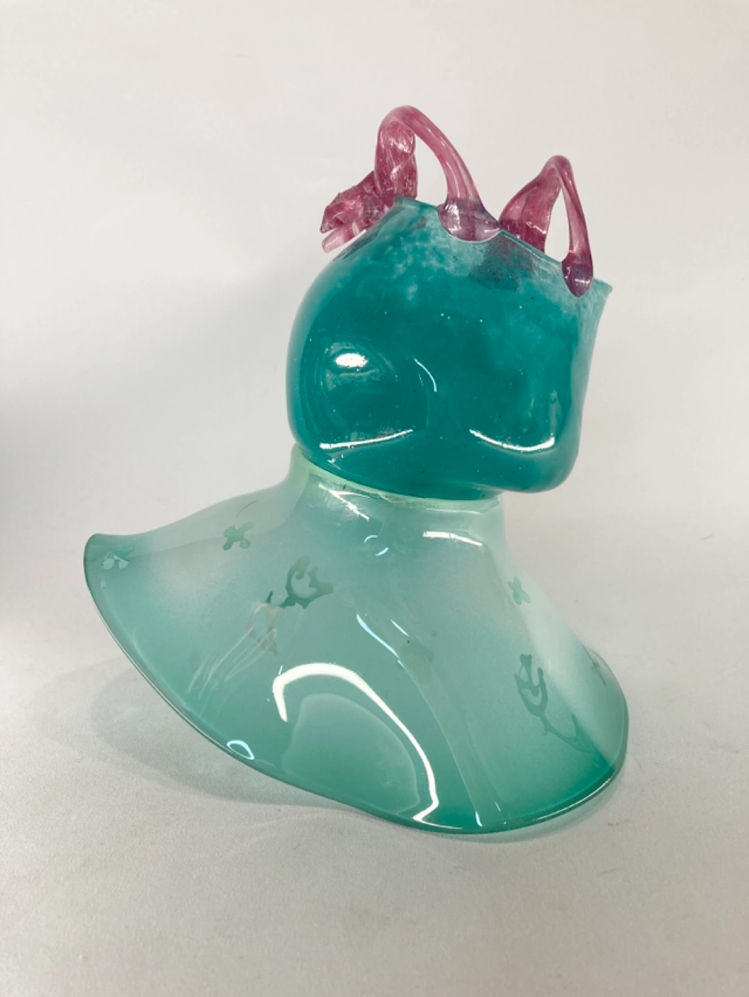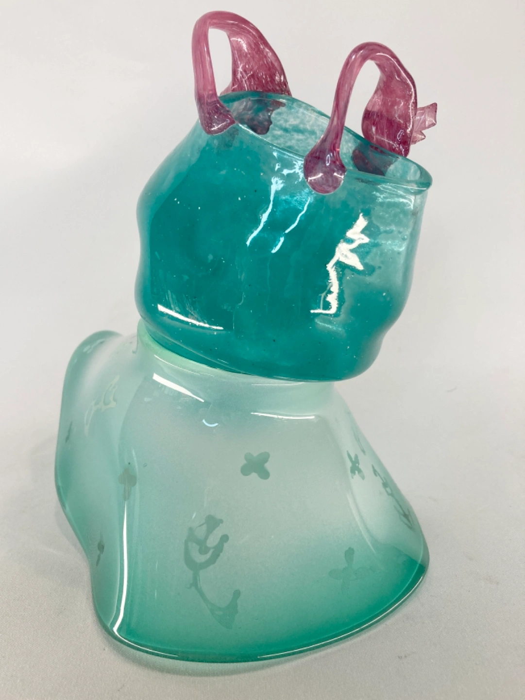 This freestanding delicate piece is a work of art, both literally and figuratively. Made in two larger pieces joined at the waist, the top apparently hand blown. With bottom printed and formed glass, then having the straps added individually shows the skill necessary for the artisan to craft this wonderful dress.