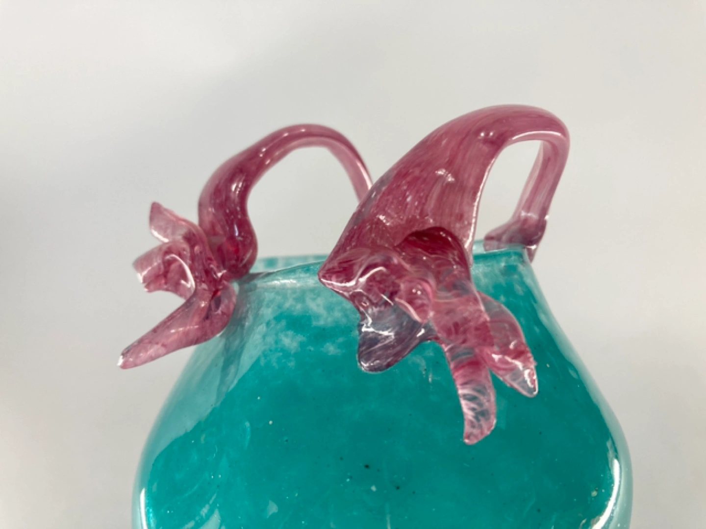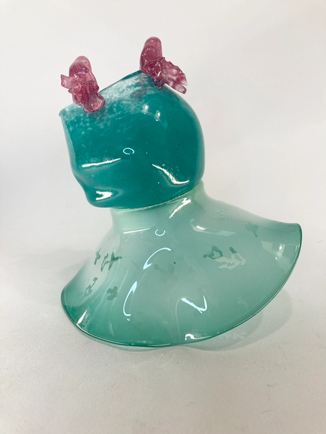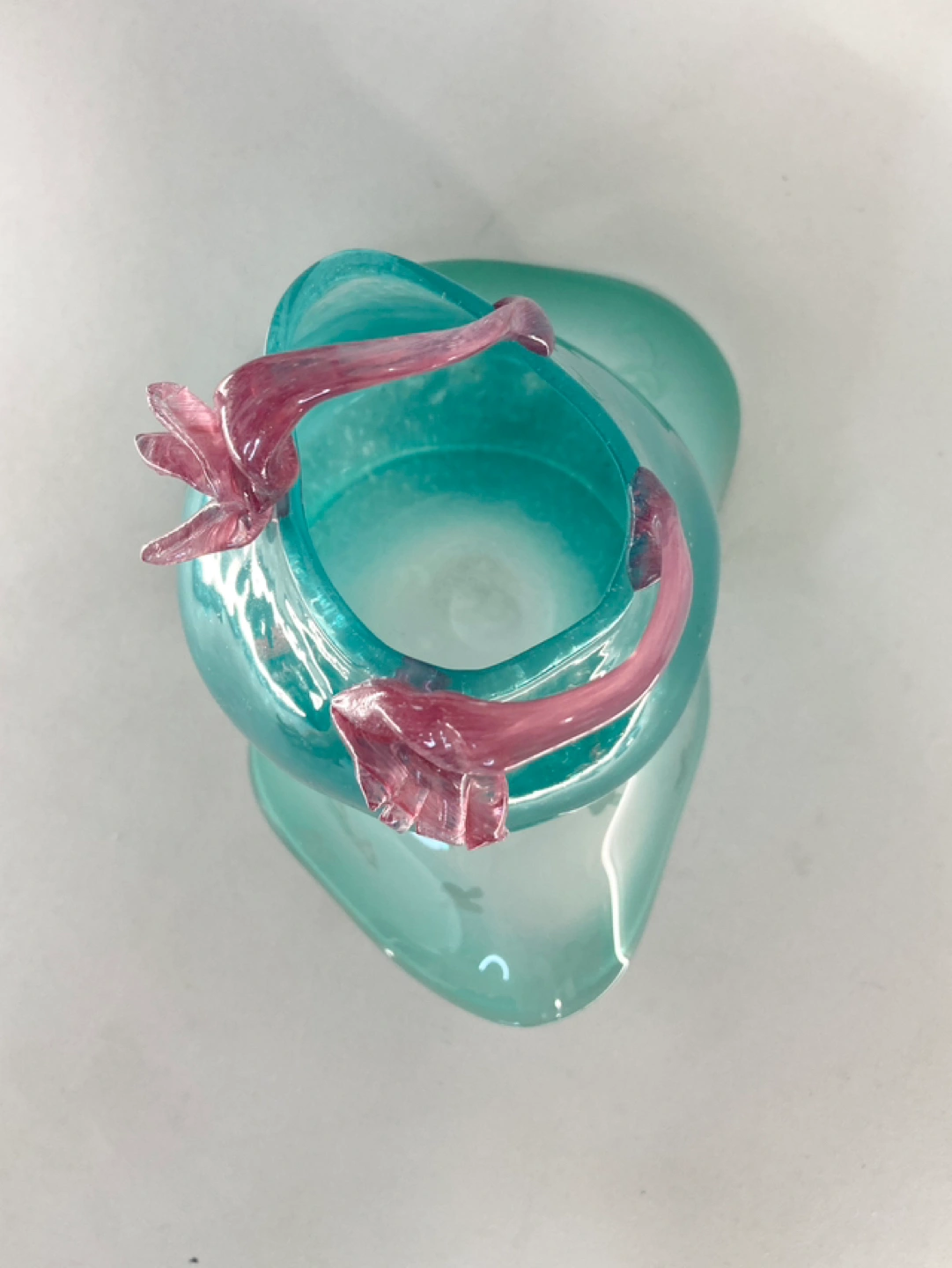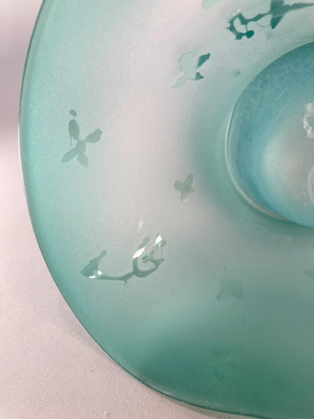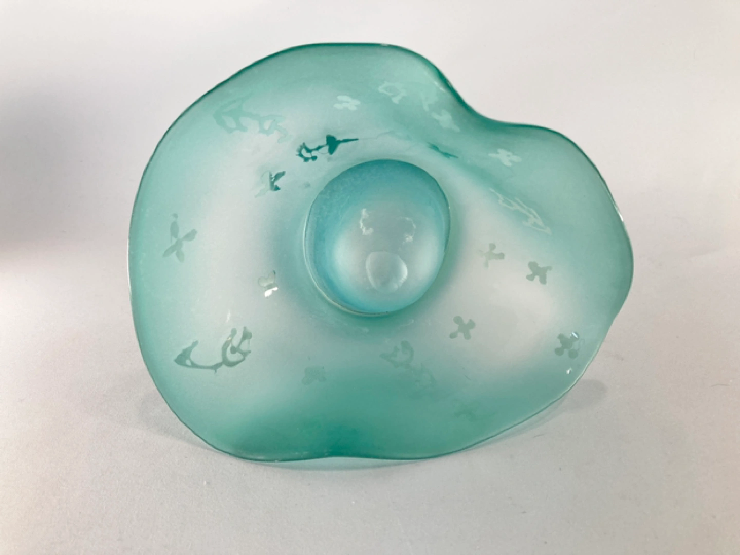 This freestanding delicate piece is a work of art, both literally and figuratively. Made in two larger pieces joined at the waist, the top apparently hand blown. With bottom printed and formed glass, then having the straps added individually shows the skill necessary for the artisan to craft this wonderful dress.