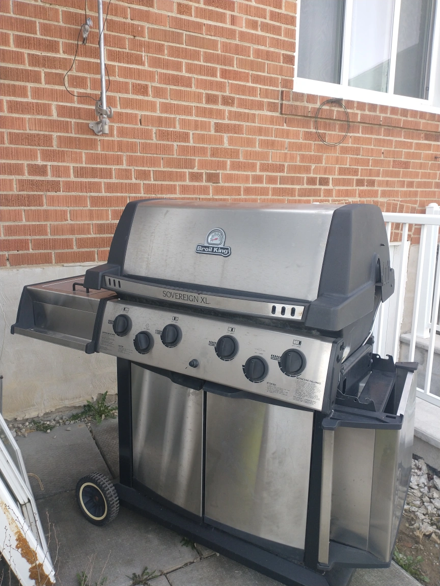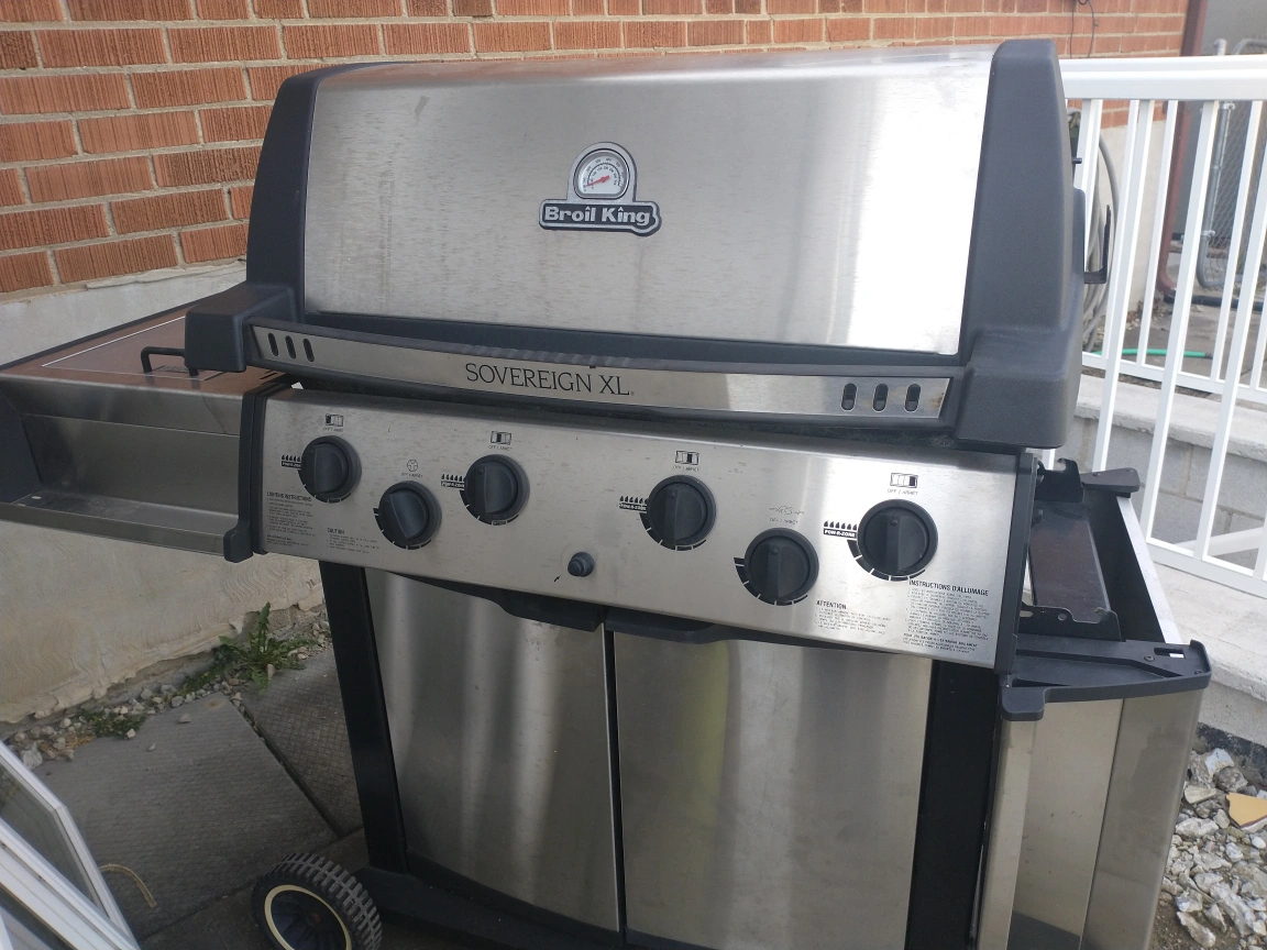 Four burner propane barbecue. Stainless steel. Needs a good clean. Used condition.Broil King XL BBQ Sovereign.As is