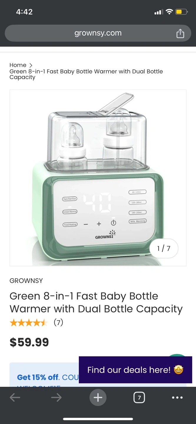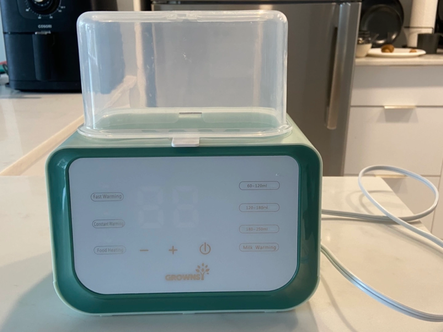 Grownsy Green baby bottle warmer. Dual bottle capacity. Features fast warming, keeps milk warm in 24hrs, food heating, steam sterilization function.