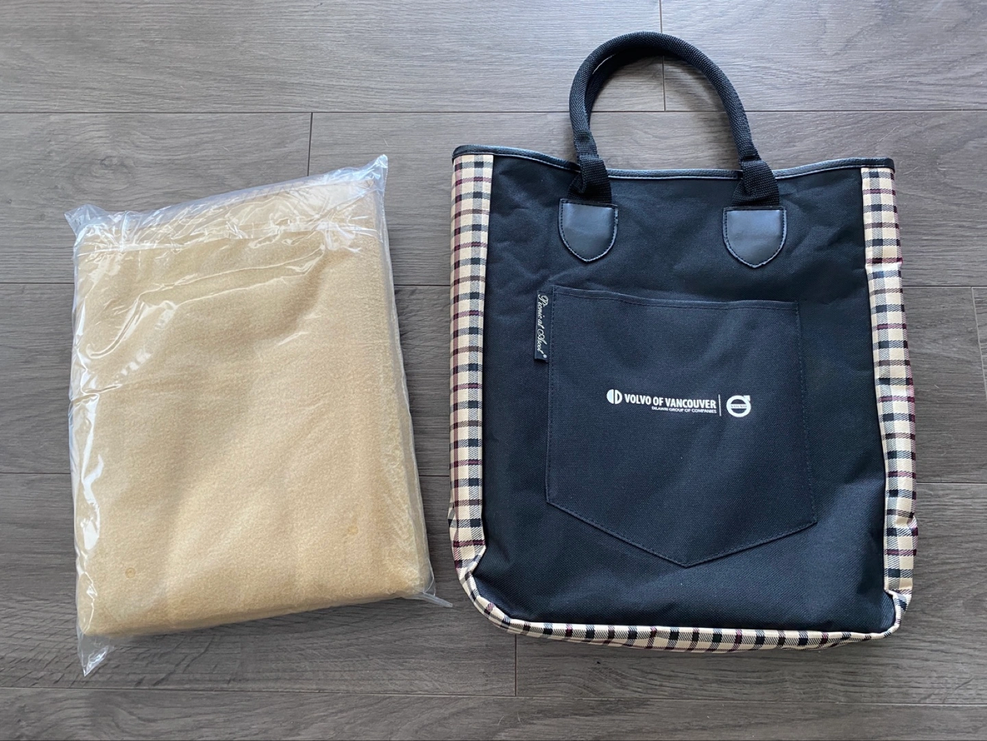 Black tote bag with plaid trim. Features a large front pocket. Includes a beige blanket. Perfect for travel or everyday use.