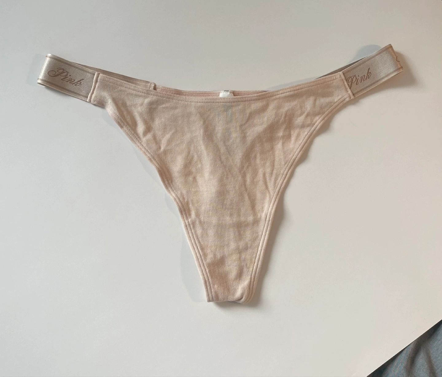 413Brand new with tags, beige coloured thong. Soft cotton material. Features the Pink logo on both waistband sides. Cash & Pick up only. (King & Blue Jays Way)