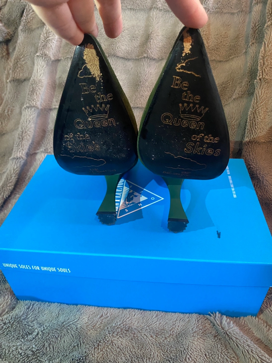 'Be the Queen of the Skies' inscribed on soles.
