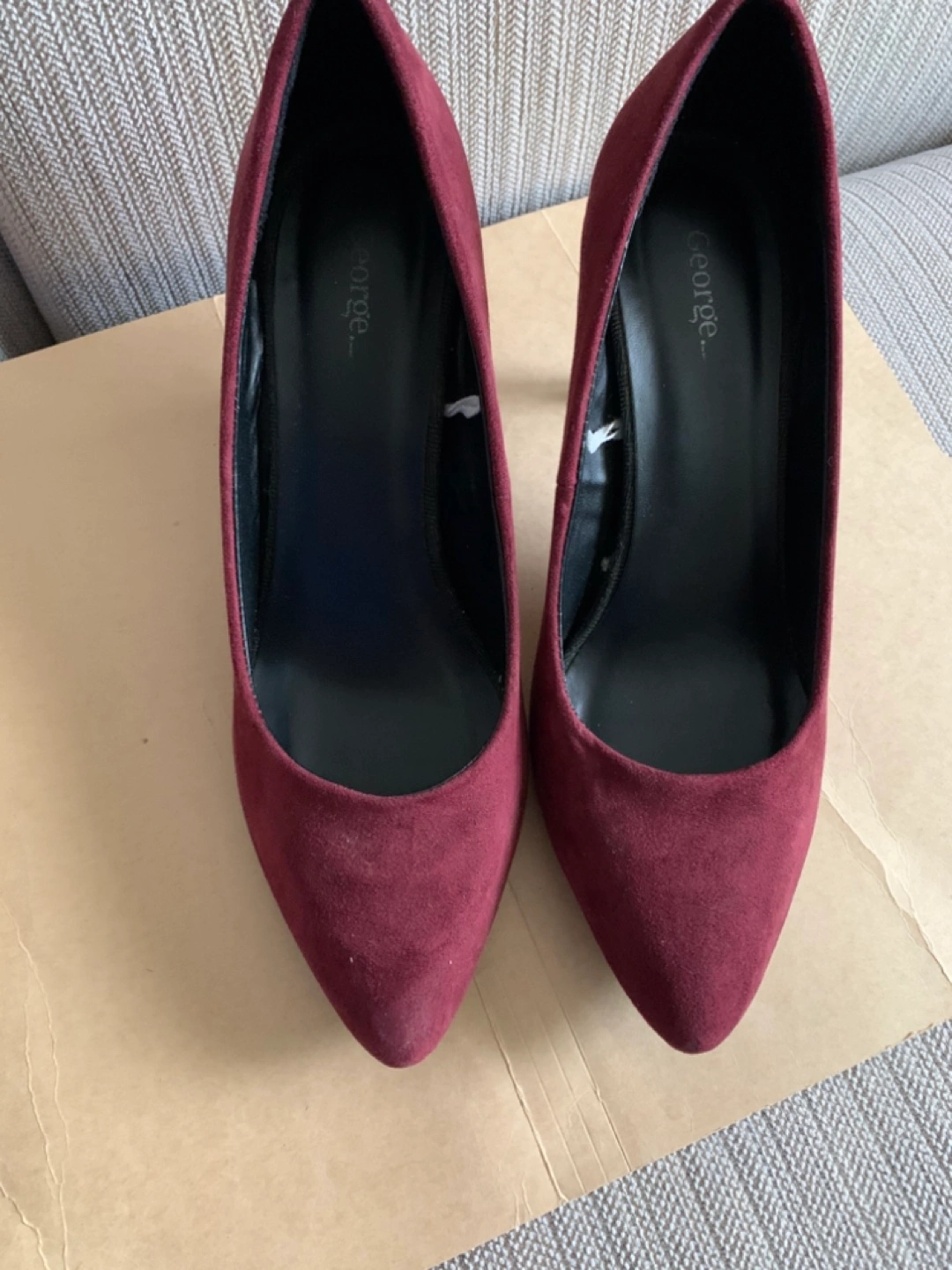 1000+Burgundy suede high heels. Size 8. Pointed toe. Made in China.