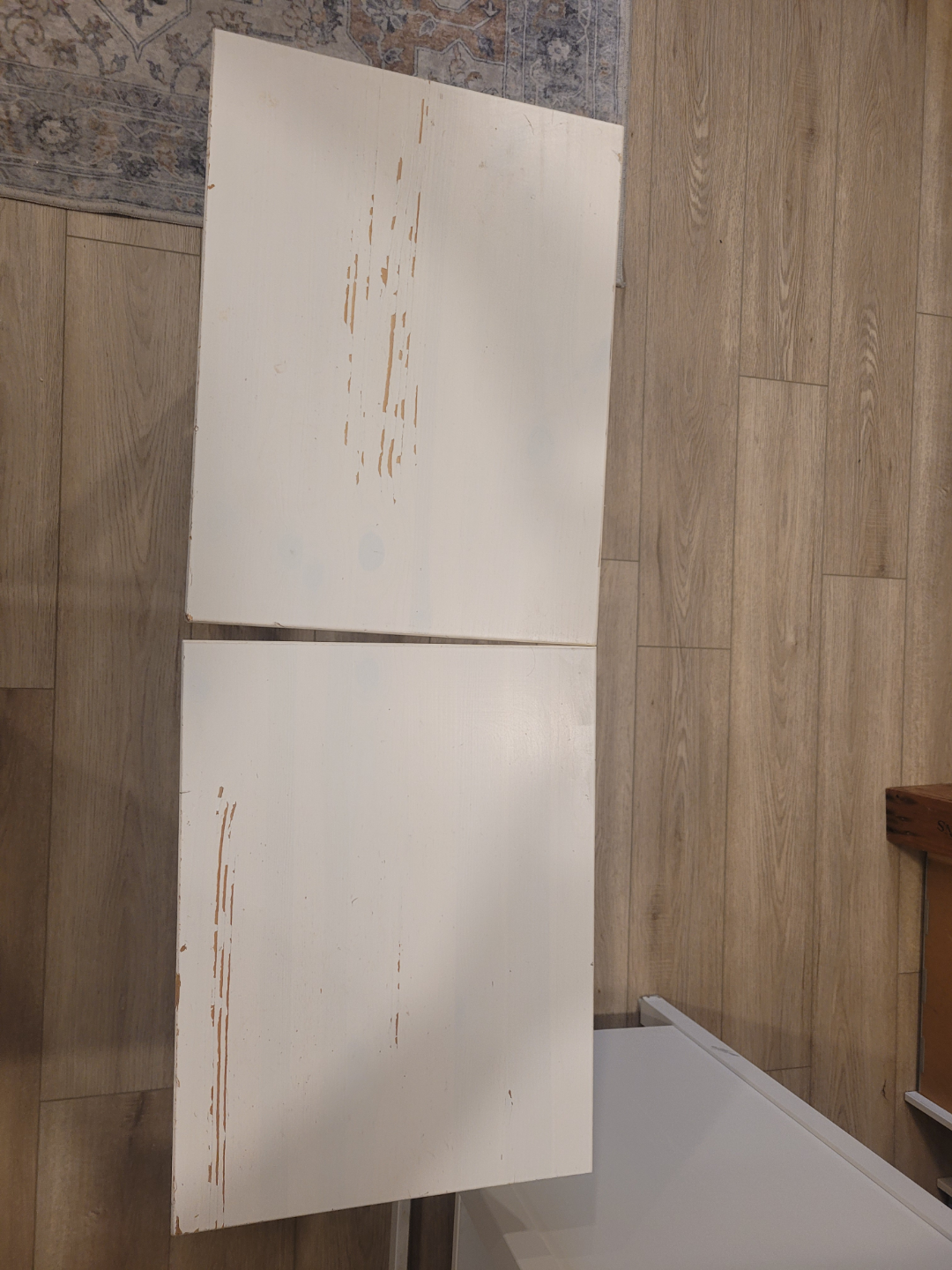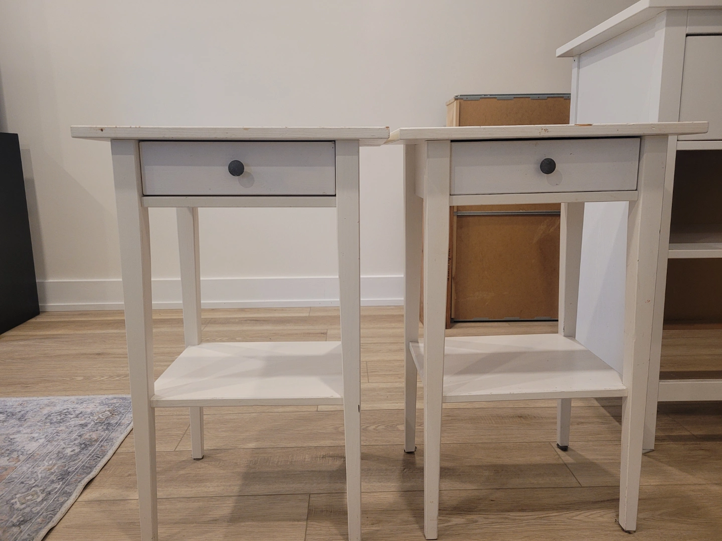 Two matching white nightstands. Small, simple design. Each features one drawer and a lower shelf. Some minor wear and tear visible on top surfaces.