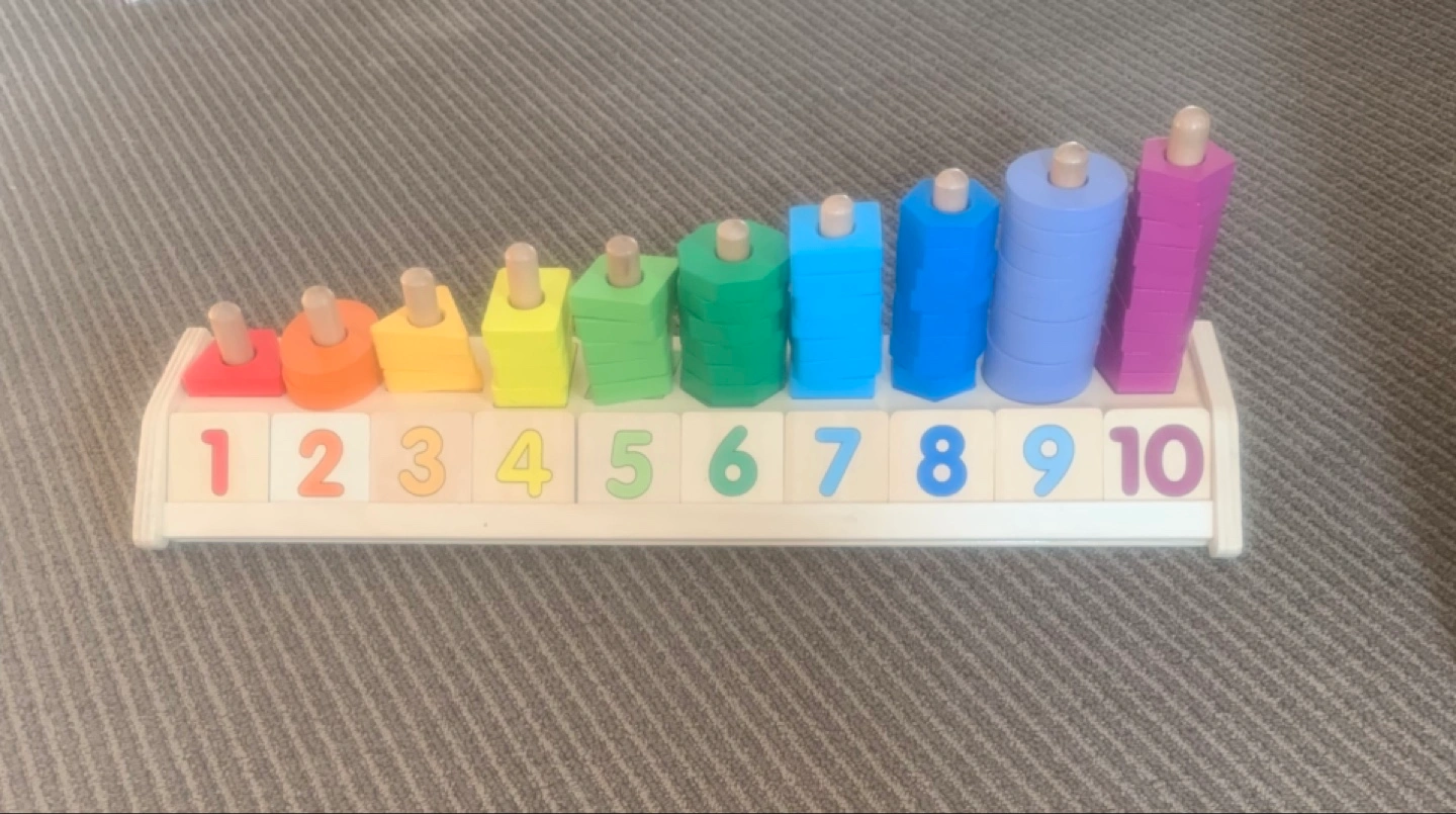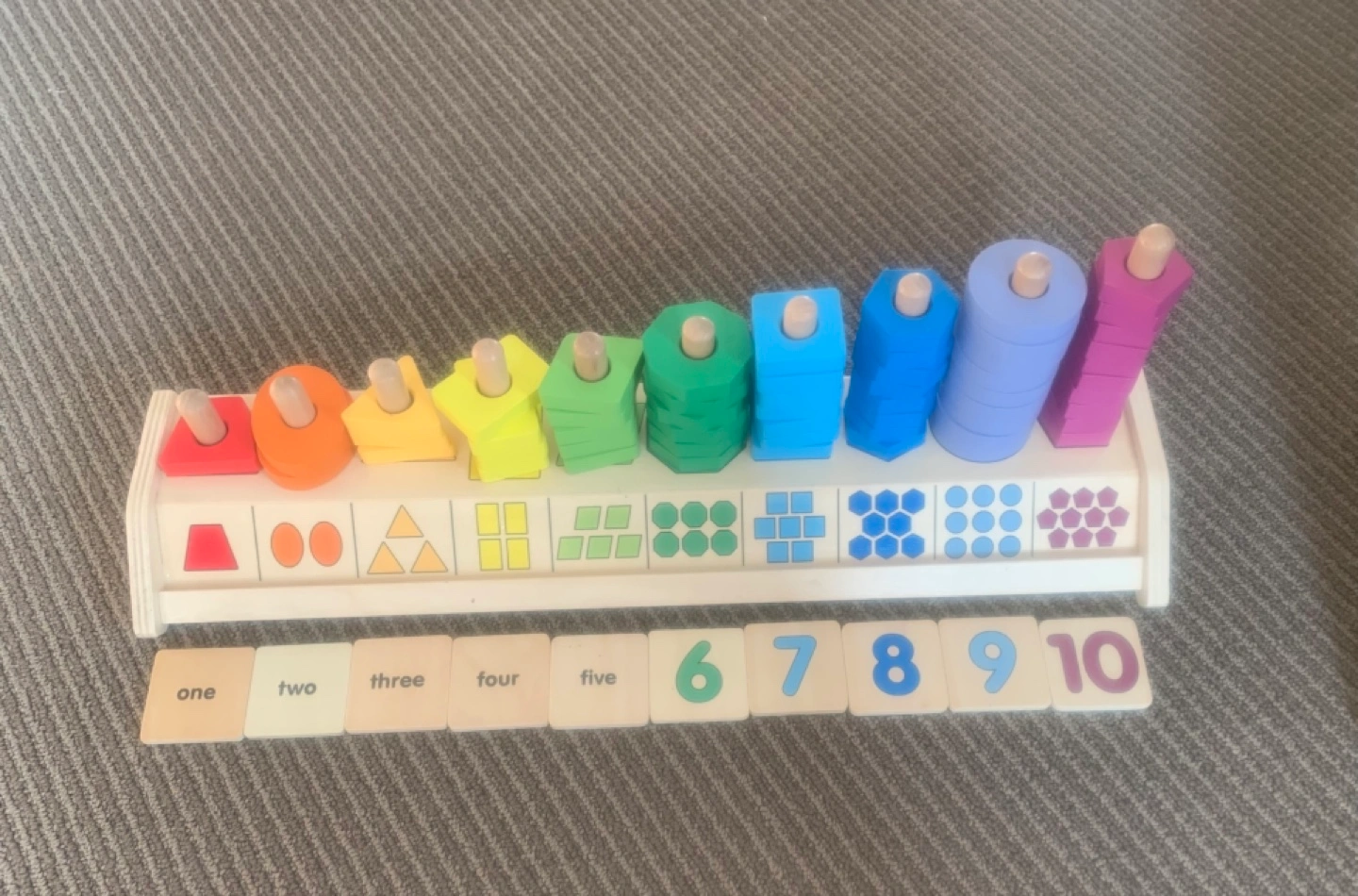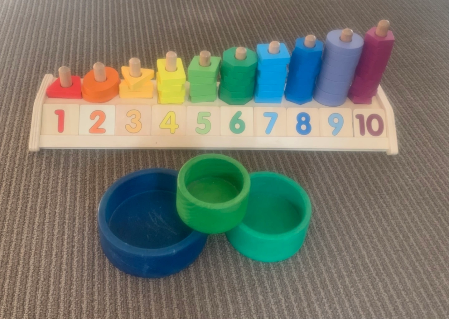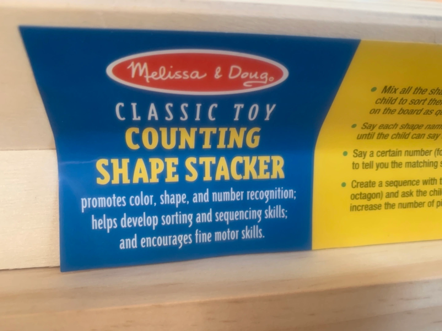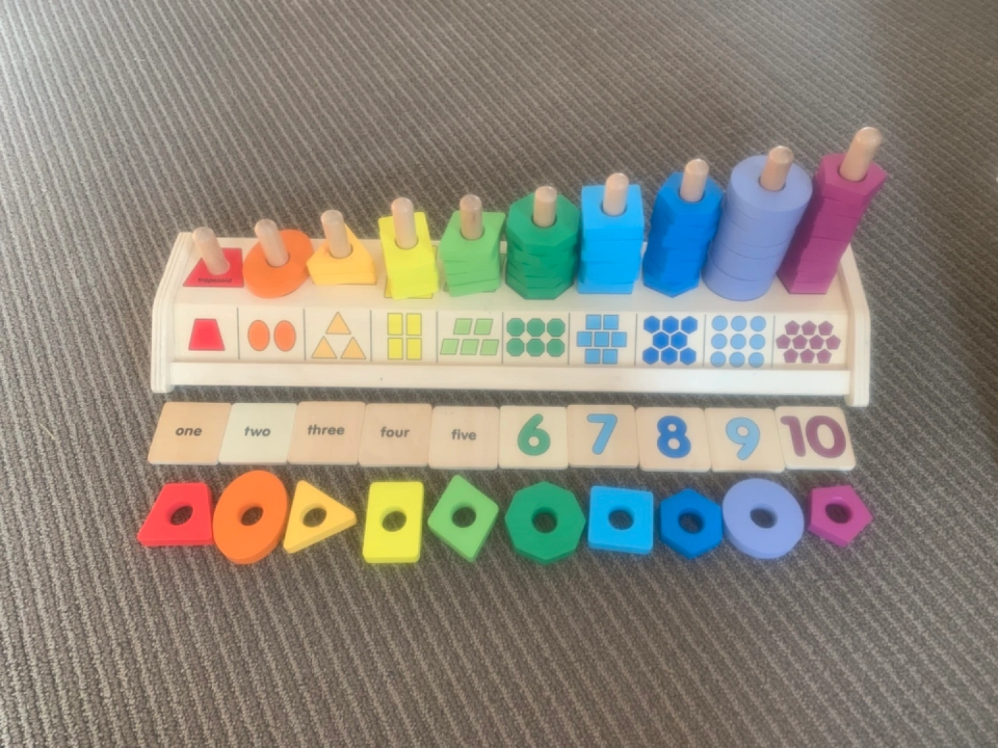 168Melissa and Doug - COUNTING SHAPE STACKER Educational Wooden Toy . Rainbow-coloured wooden stacking toy. Ten columns of increasing height. Numbers 1-10. Geometric shapes. Includes three nesting wooden cups. Excellent educational toy for preschoolers. Pick up at Eglinton Ave east at Bayview.