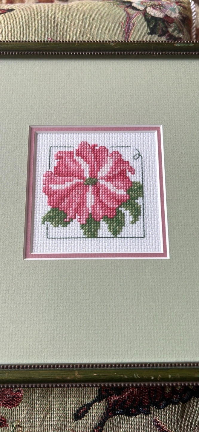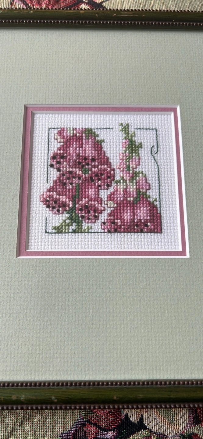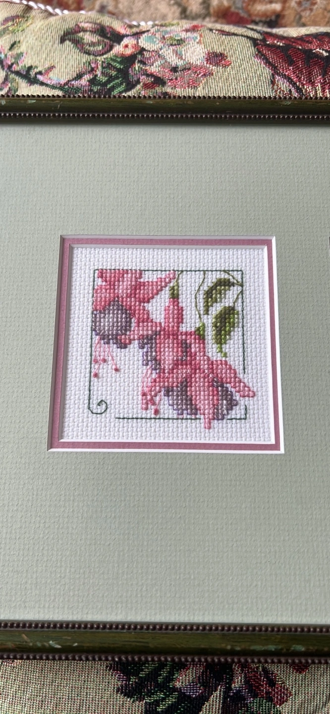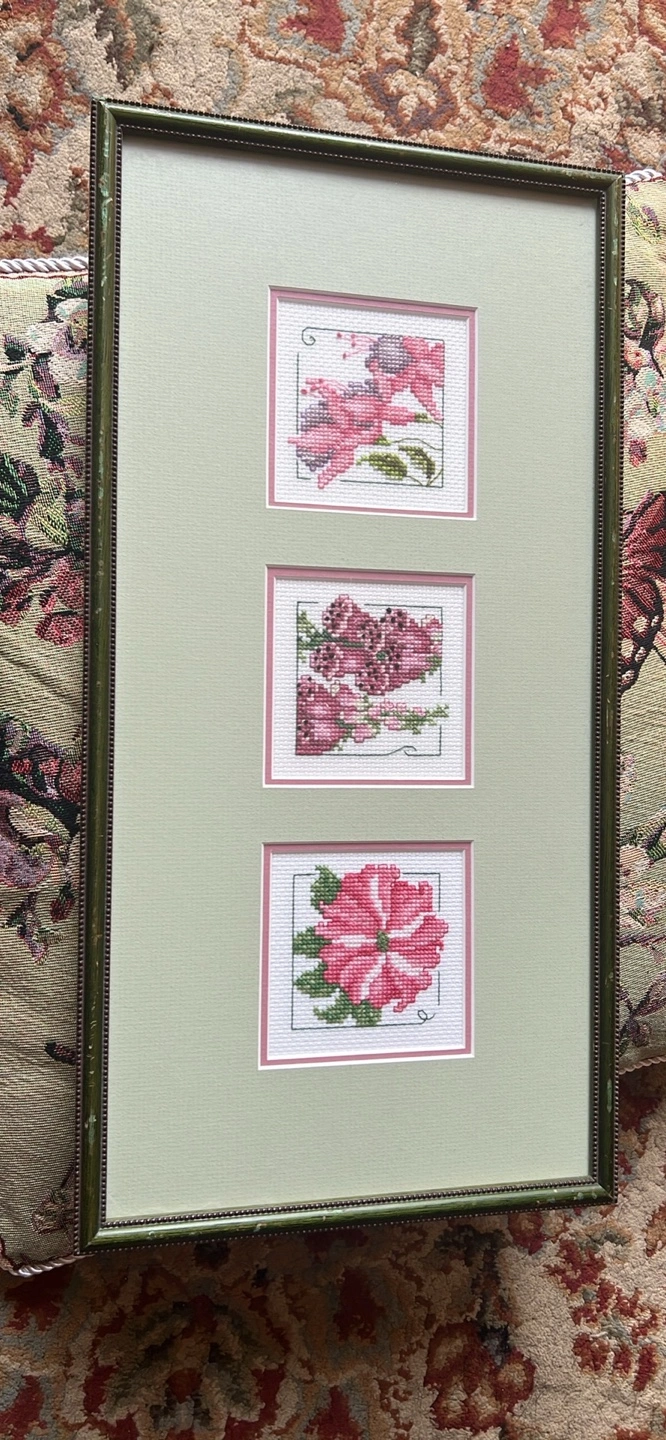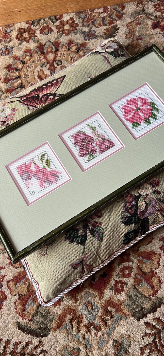 Three framed cross stitch pieces. Floral designs in shades of pink and green. Nicely framed, ready to hang. A lovely addition to any home décor.