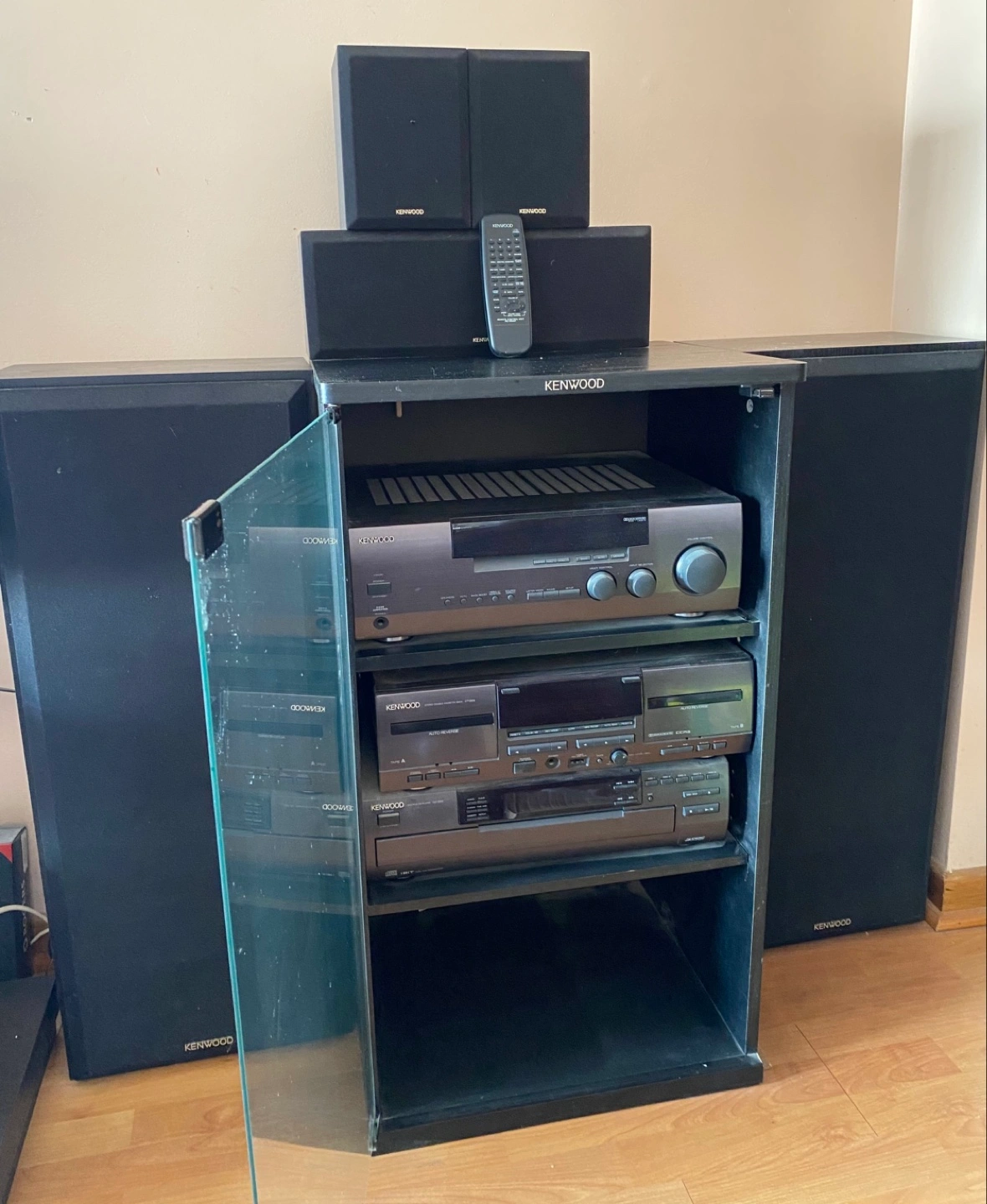 Complete Kenwood home theatre system. Includes receiver, CD player, cassette deck, speakers and subwoofer. All components in good working order. Great for collectors or retro enthusiasts.