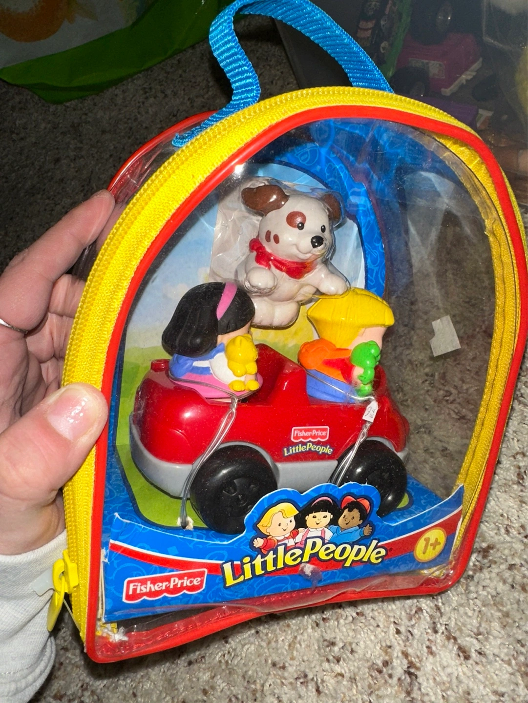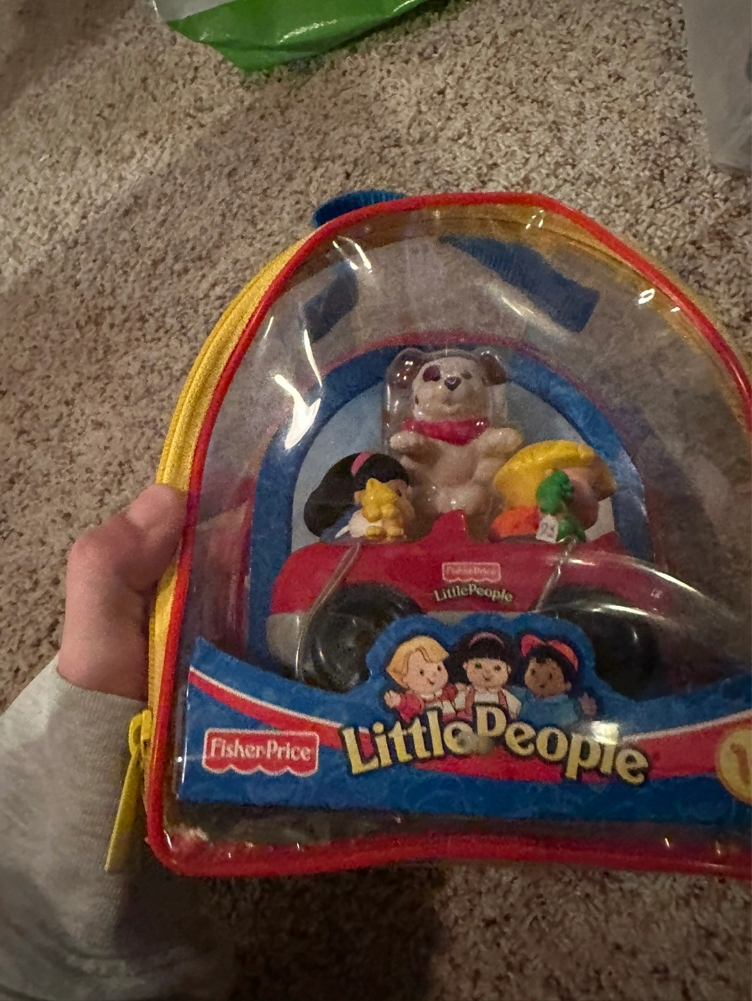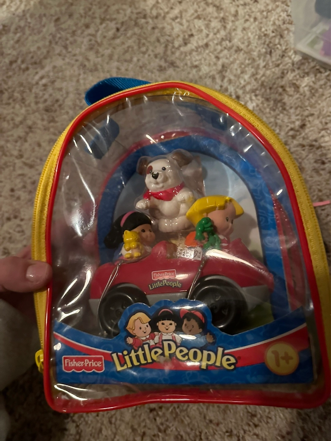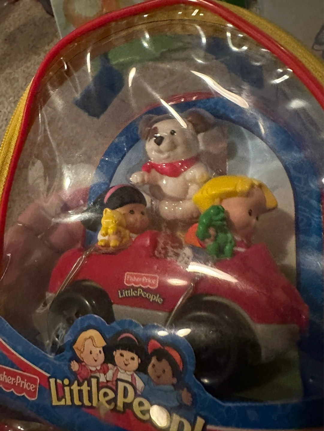 Adorable Little People playset. Includes red car, two people, and a dog. All contained within a clear carrying case with a zipper. Great for little kids .