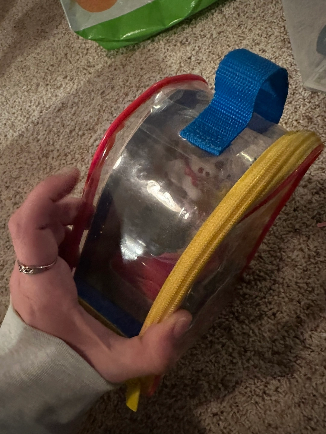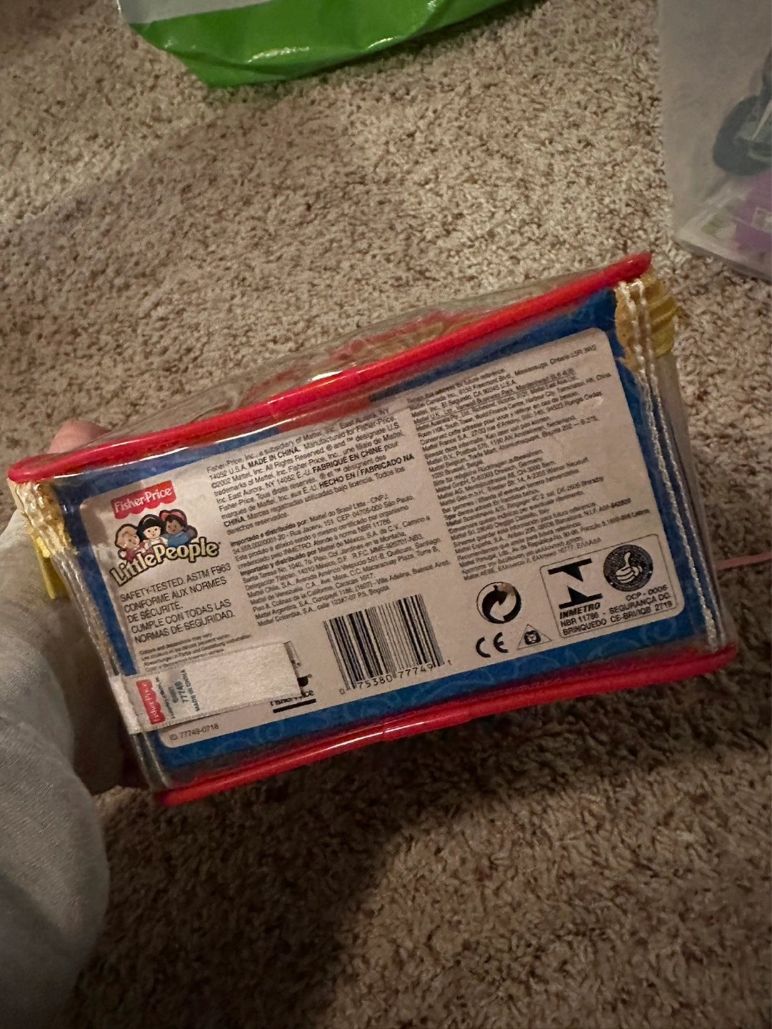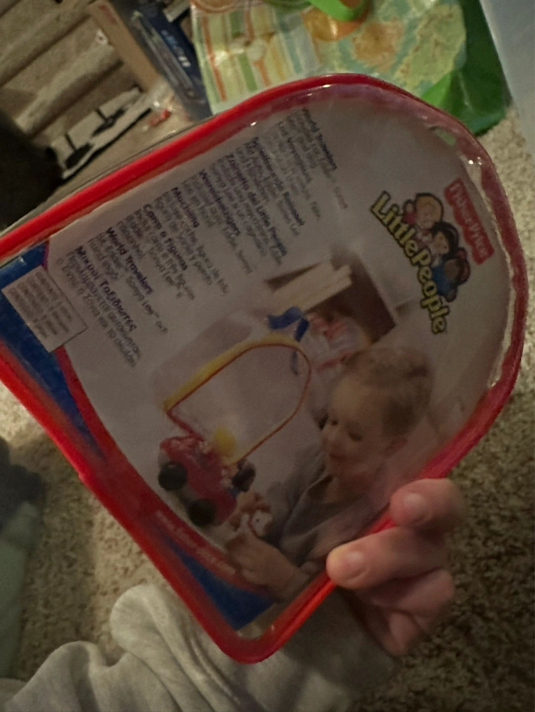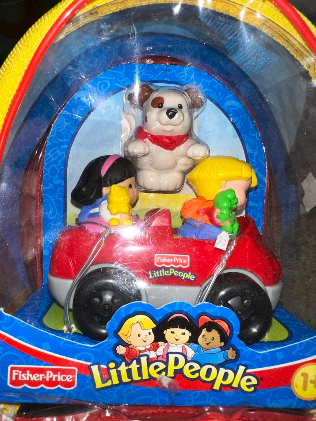 Adorable Little People playset. Includes red car, two people, and a dog. All contained within a clear carrying case with a zipper. Great for little kids .