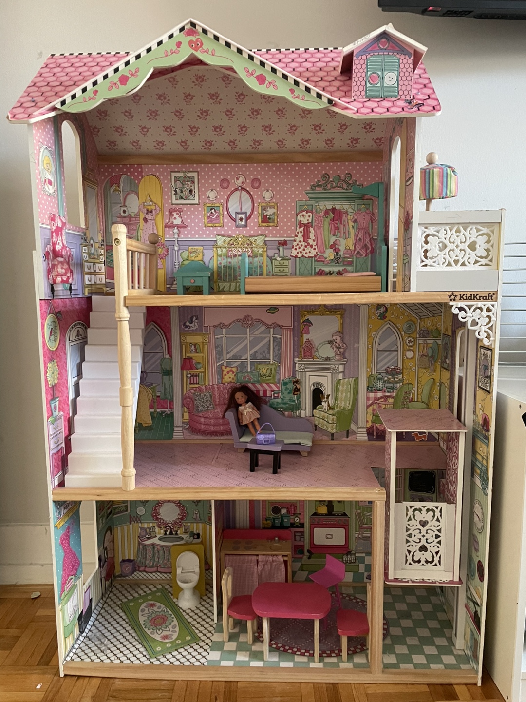 Adorable dollhouse. Multiple rooms and floors. Great condition. Includes some furniture, and more toys for the house. It comes assembled.
