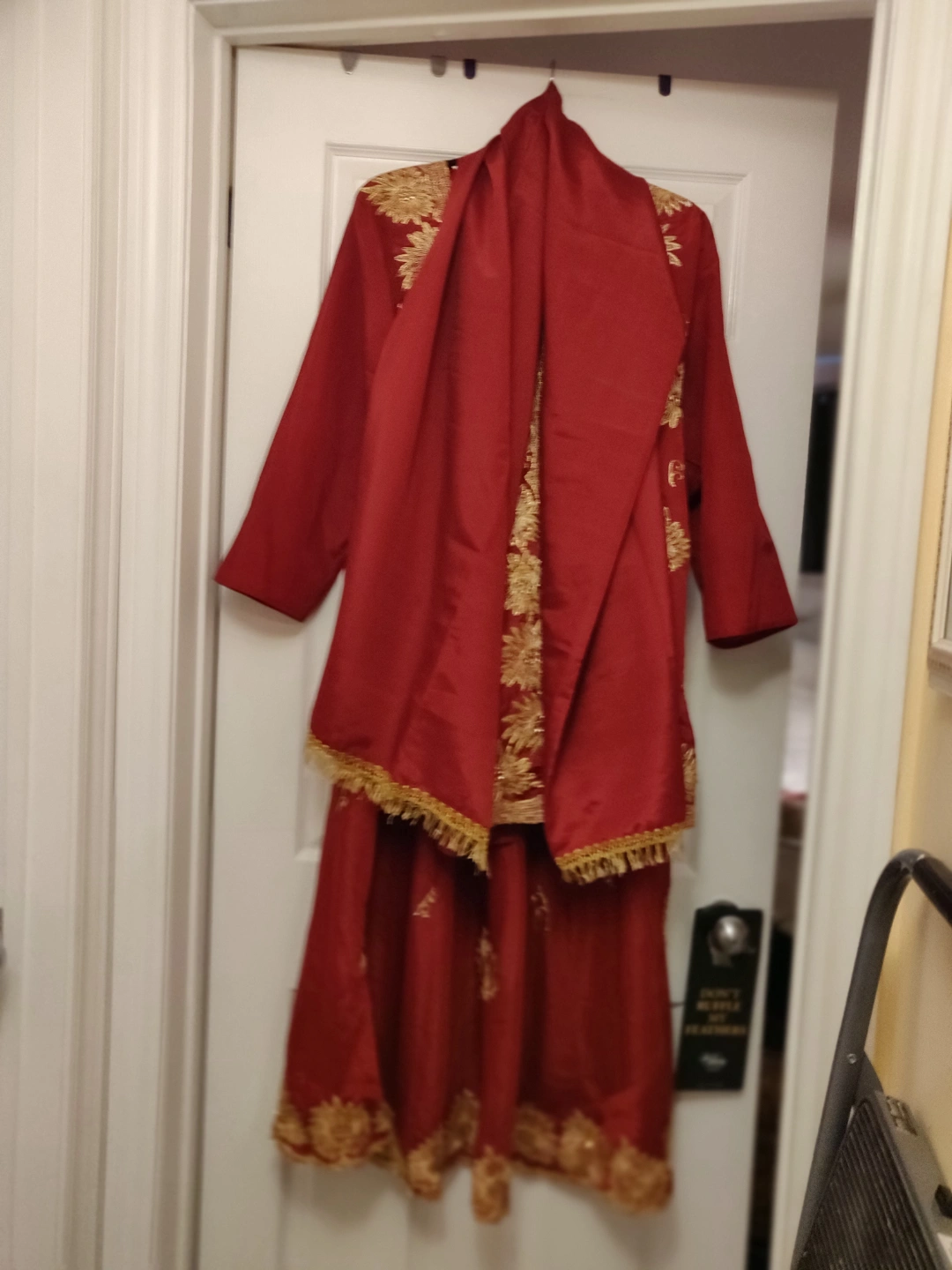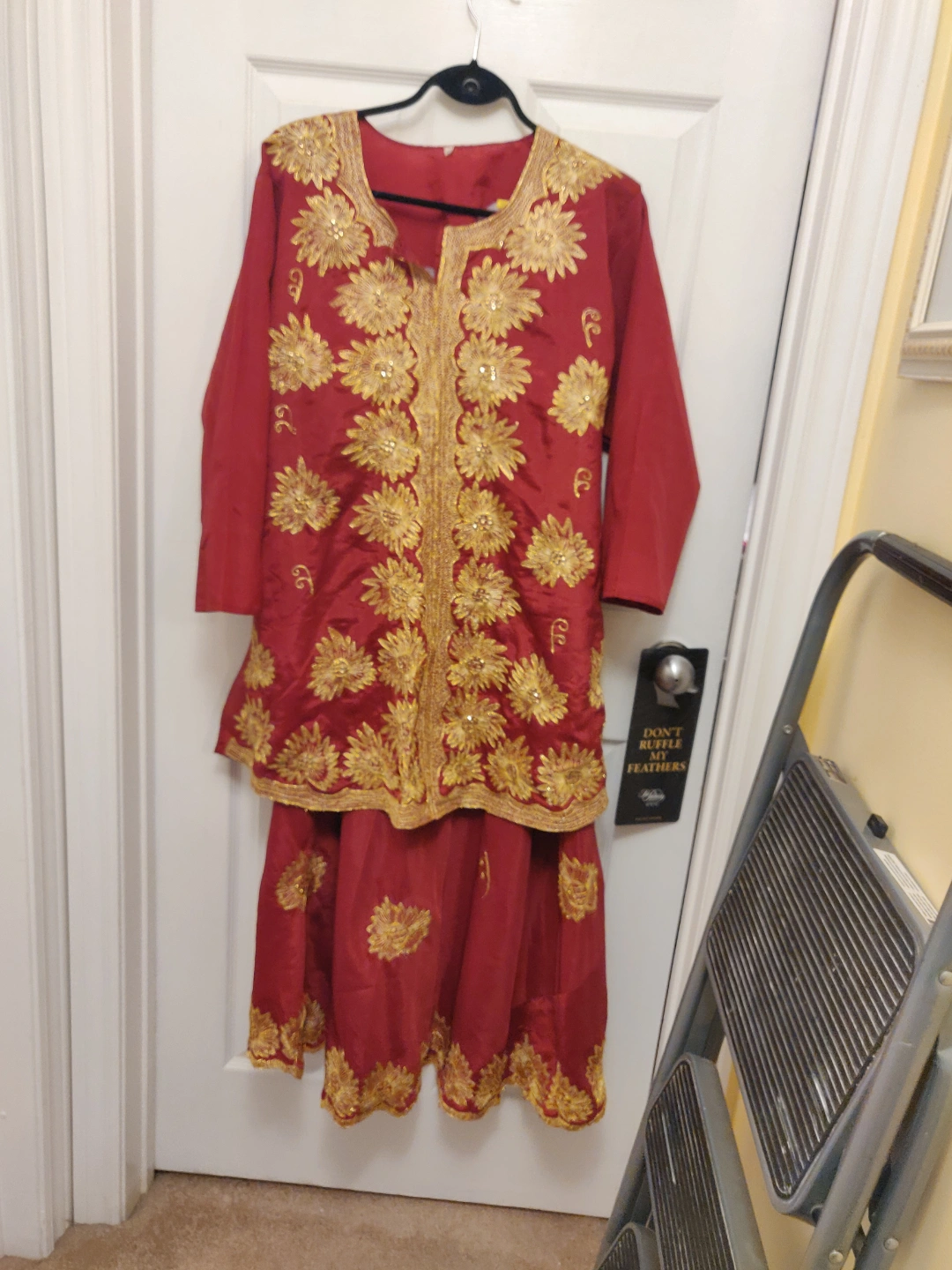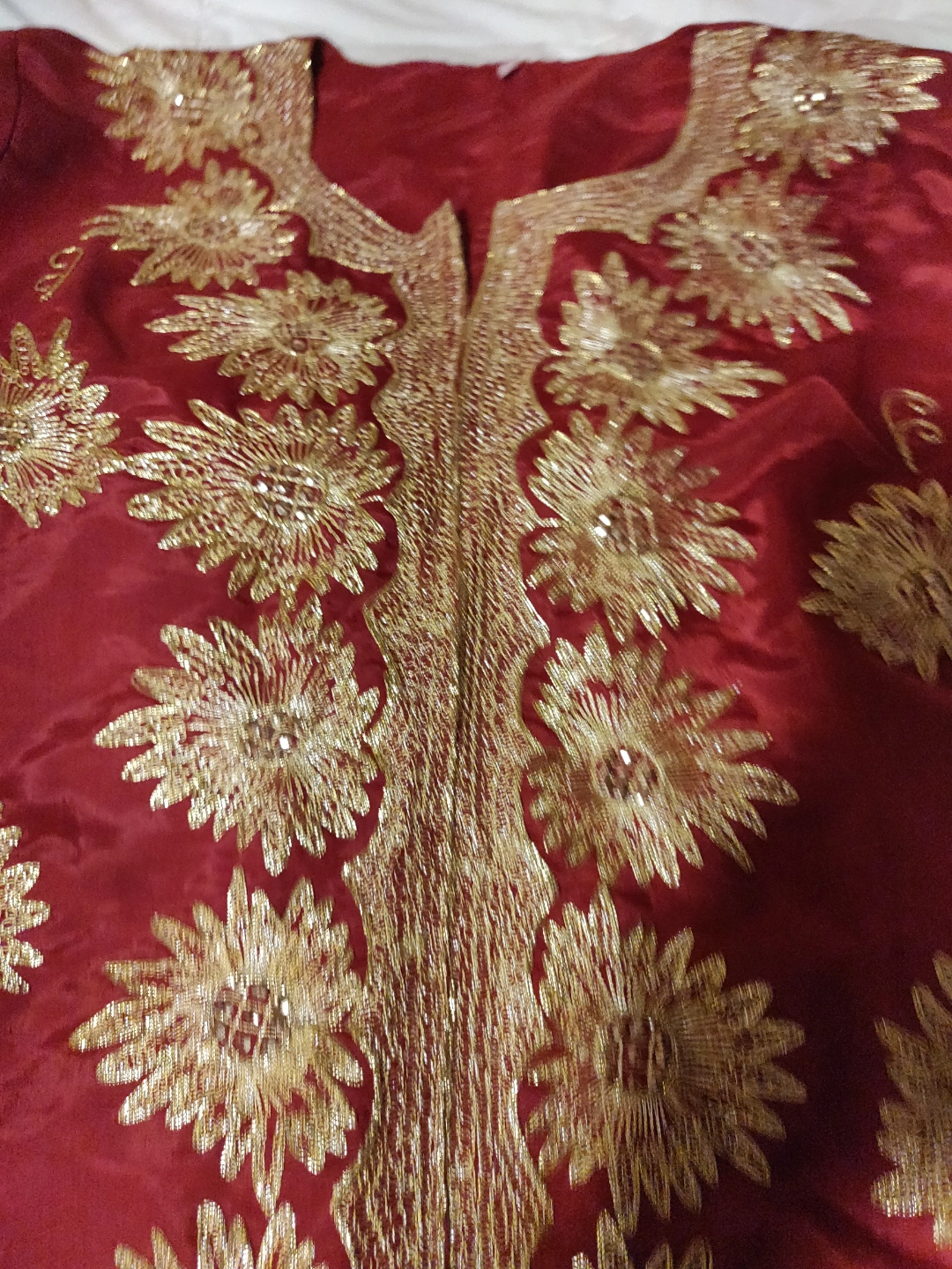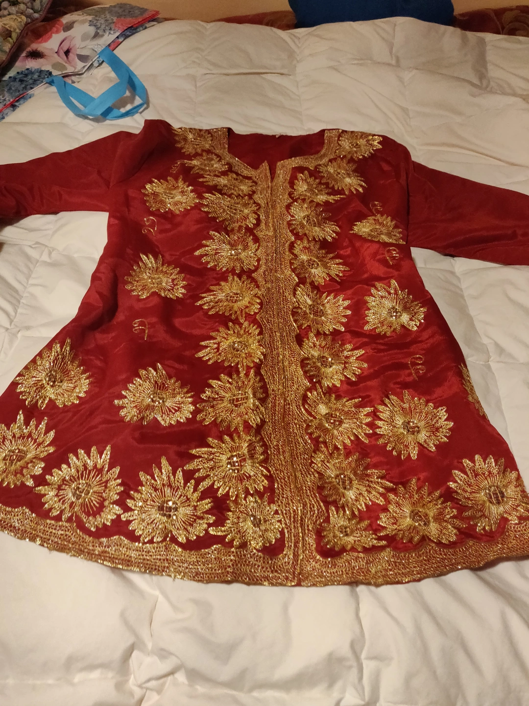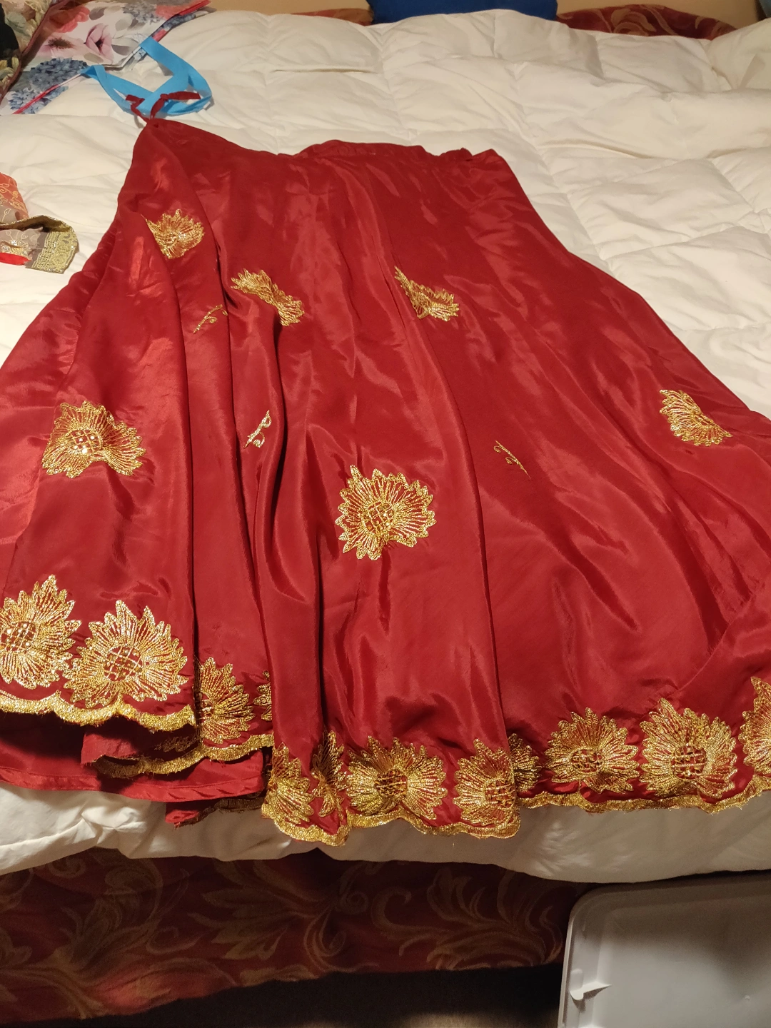 This attractive 3 pieces Lehenga Choli was worn once , it's in great condition, it's says size 50 on the tag and it's a silky material with gold embroidery . Fits M/L