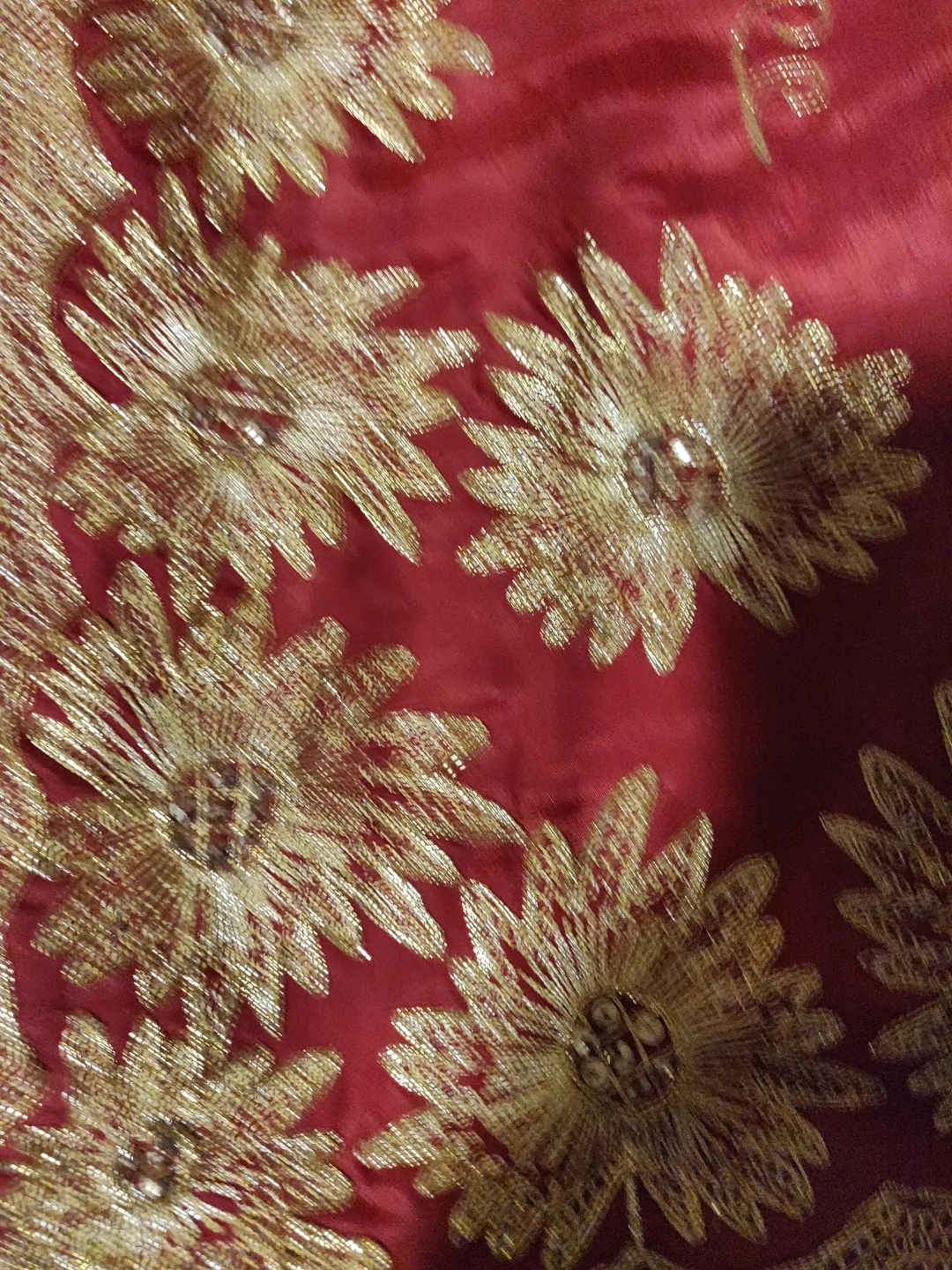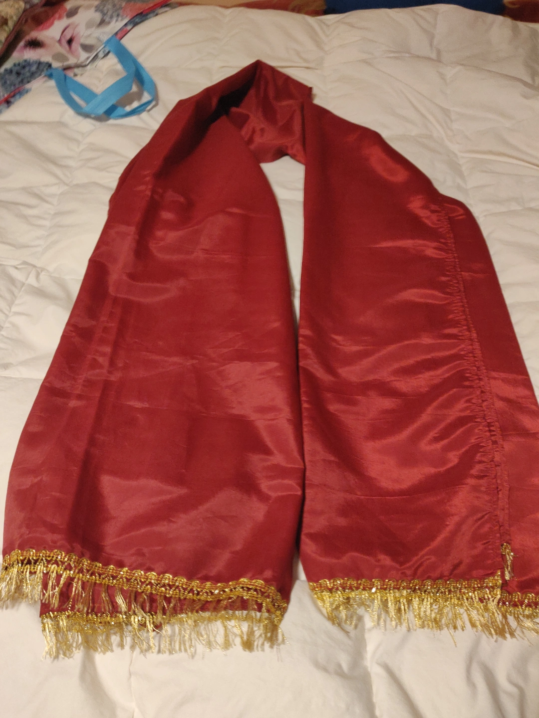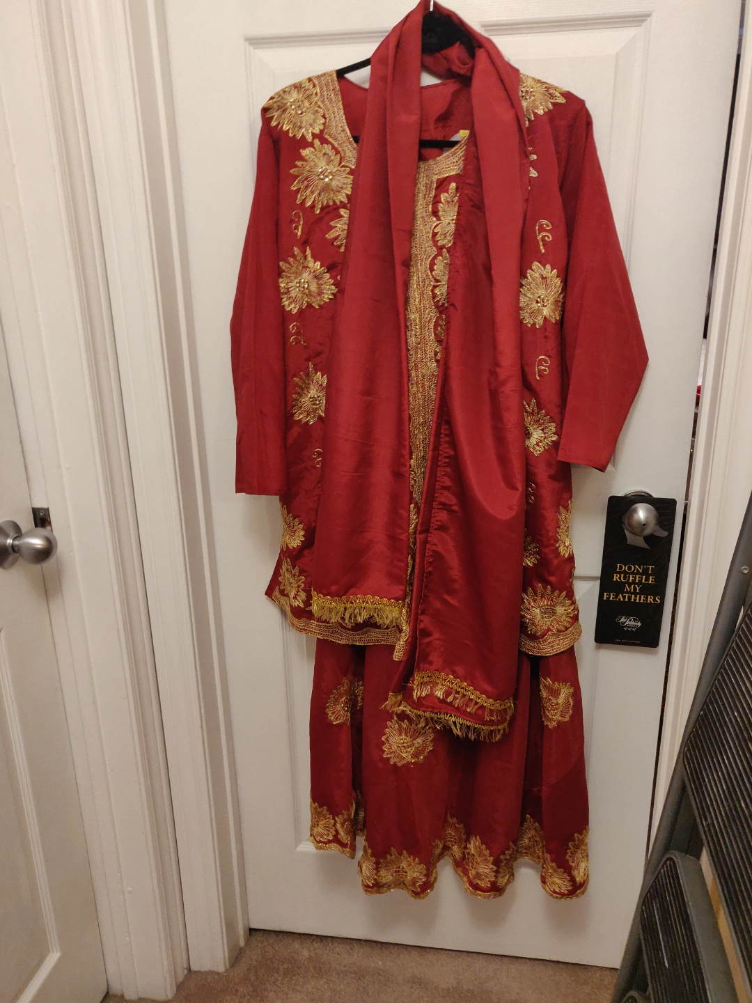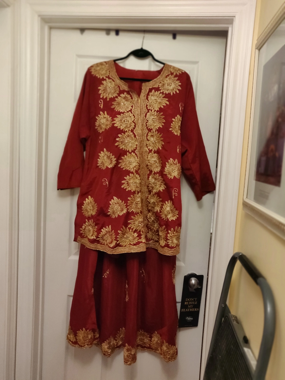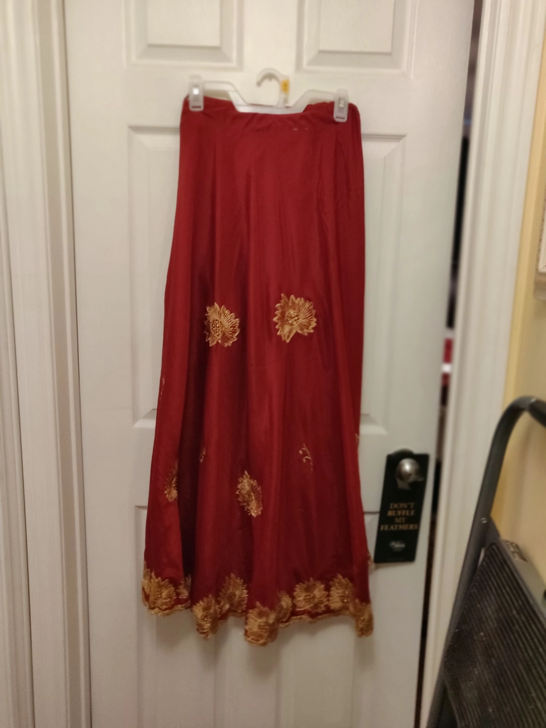 This attractive 3 pieces Lehenga Choli was worn once , it's in great condition, it's says size 50 on the tag and it's a silky material with gold embroidery . Fits M/L