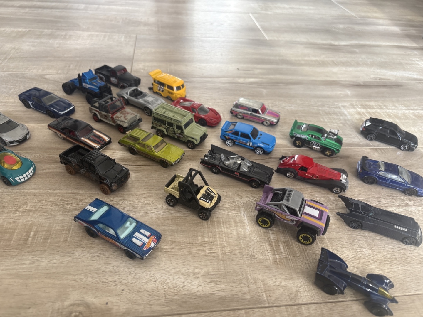 Collection of twenty Hot Wheels die-cast cars. Various makes and models. Includes Batmobiles and other unique vehicles. Great for collectors or children.
