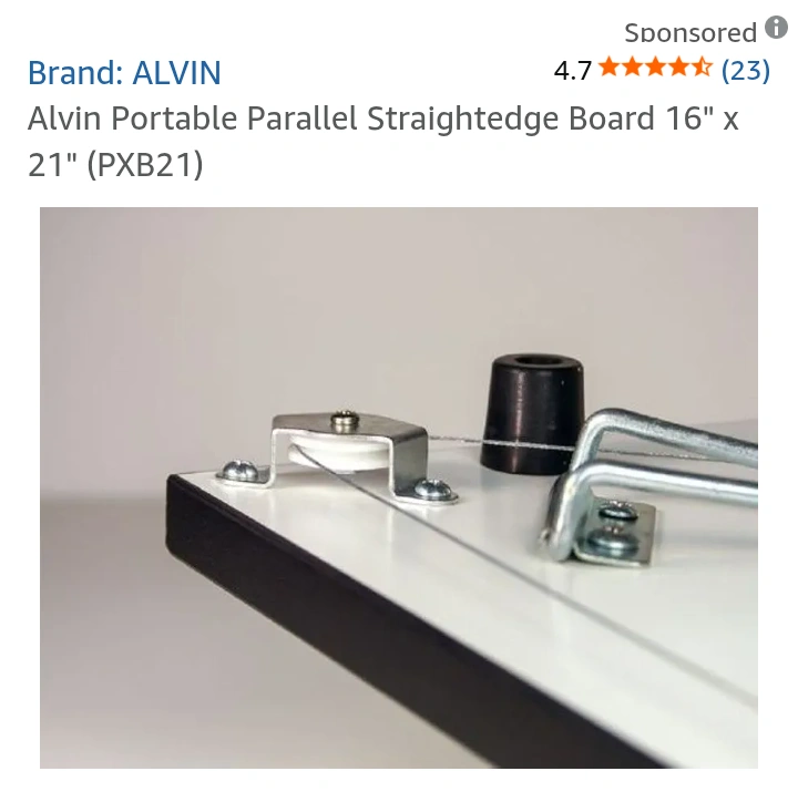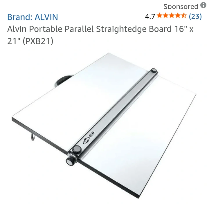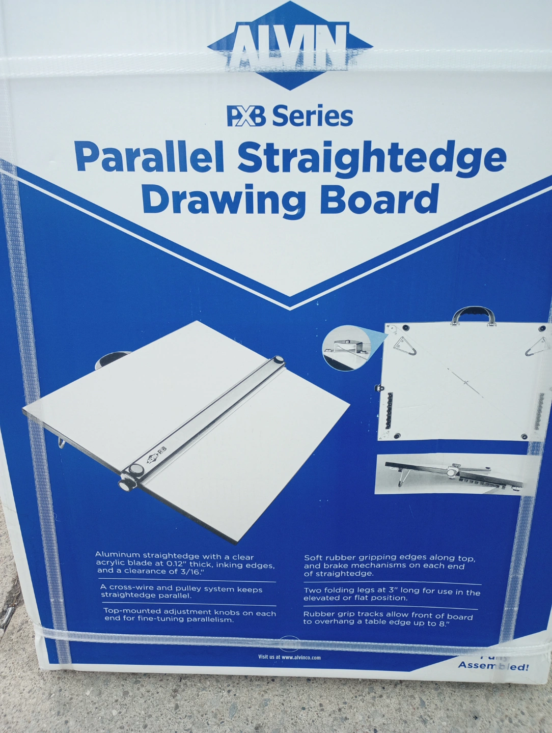 Portable parallel straightedge drawing board. Measures 16" x 21". Features a parallel motion system. Includes a straightedge and folding legs. Great for drafting and technical drawing.