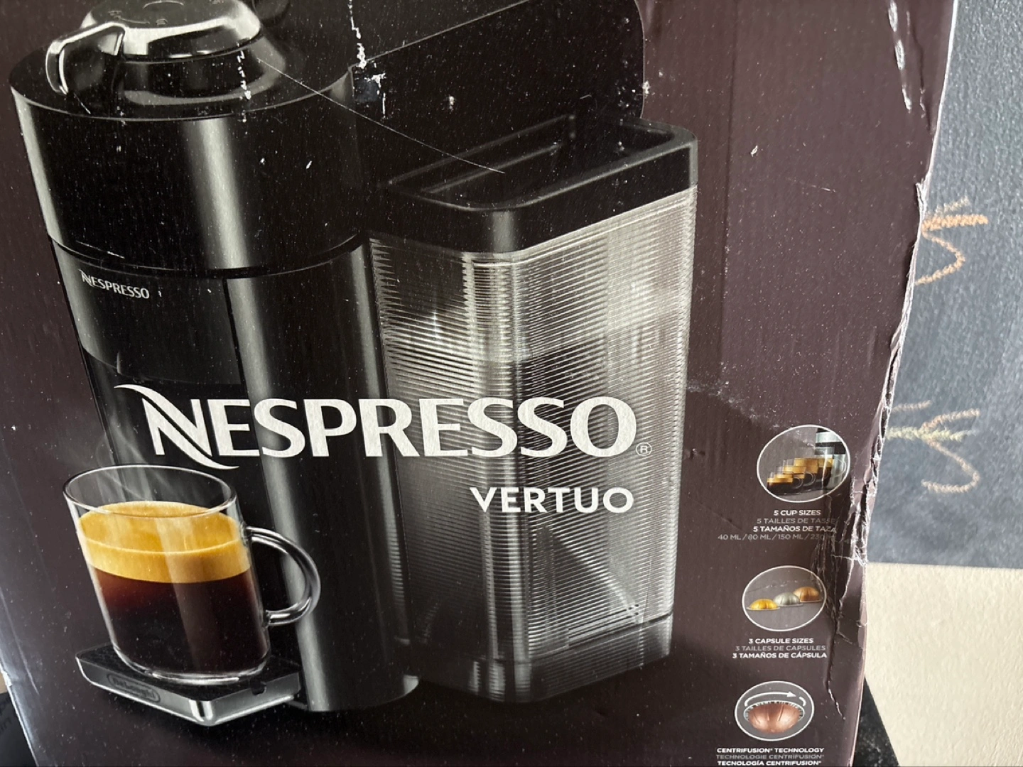 Brand new Nespresso Vertuo coffee machine. Still in original packaging. Makes 5 cup sizes. Features Centrifusion Technology. Includes used capsule container. Delicious coffee. Great for home or dorm. Pods not included.