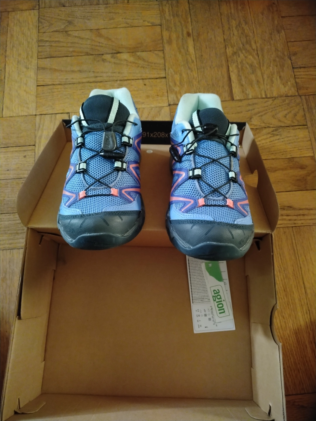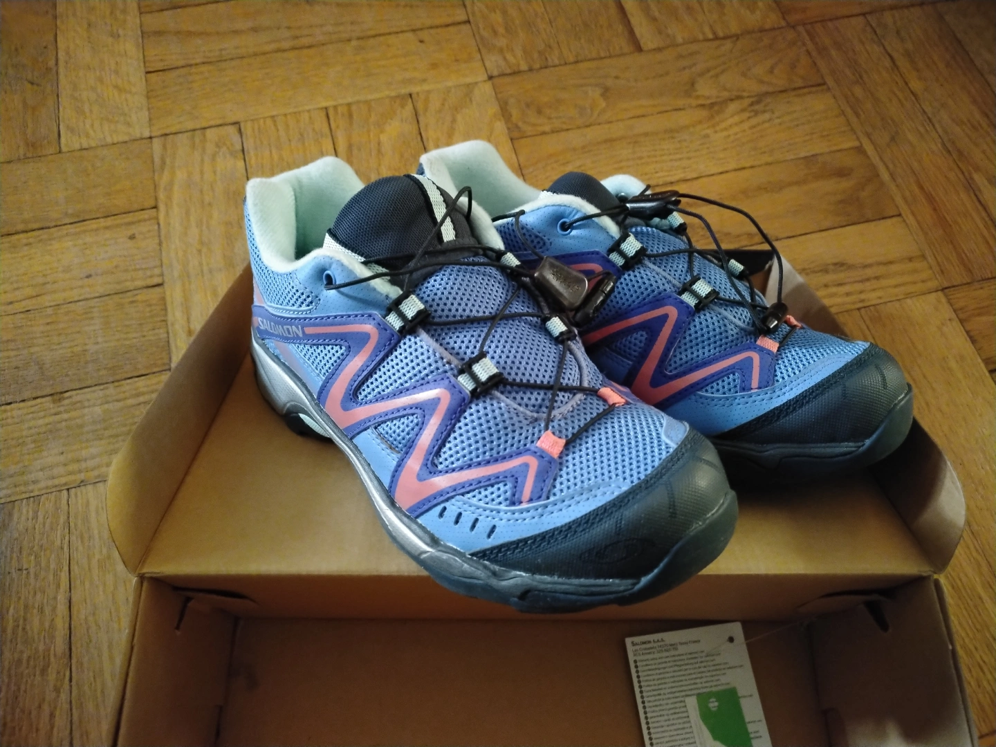 New Salomon hiking shoes for kids. Blue with coral accents. Excellent condition. Includes original box. Size 36