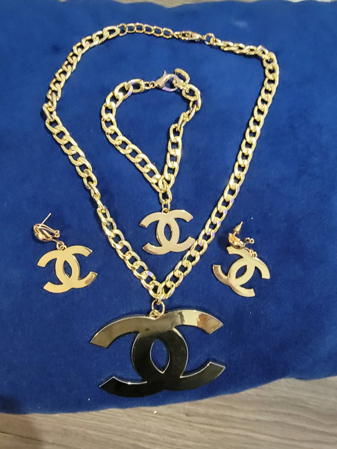 Gorgeous gold-toned necklace, bracelet, and earrings set. Features iconic interlocking CC logo. Chain-link design. Statement piece.