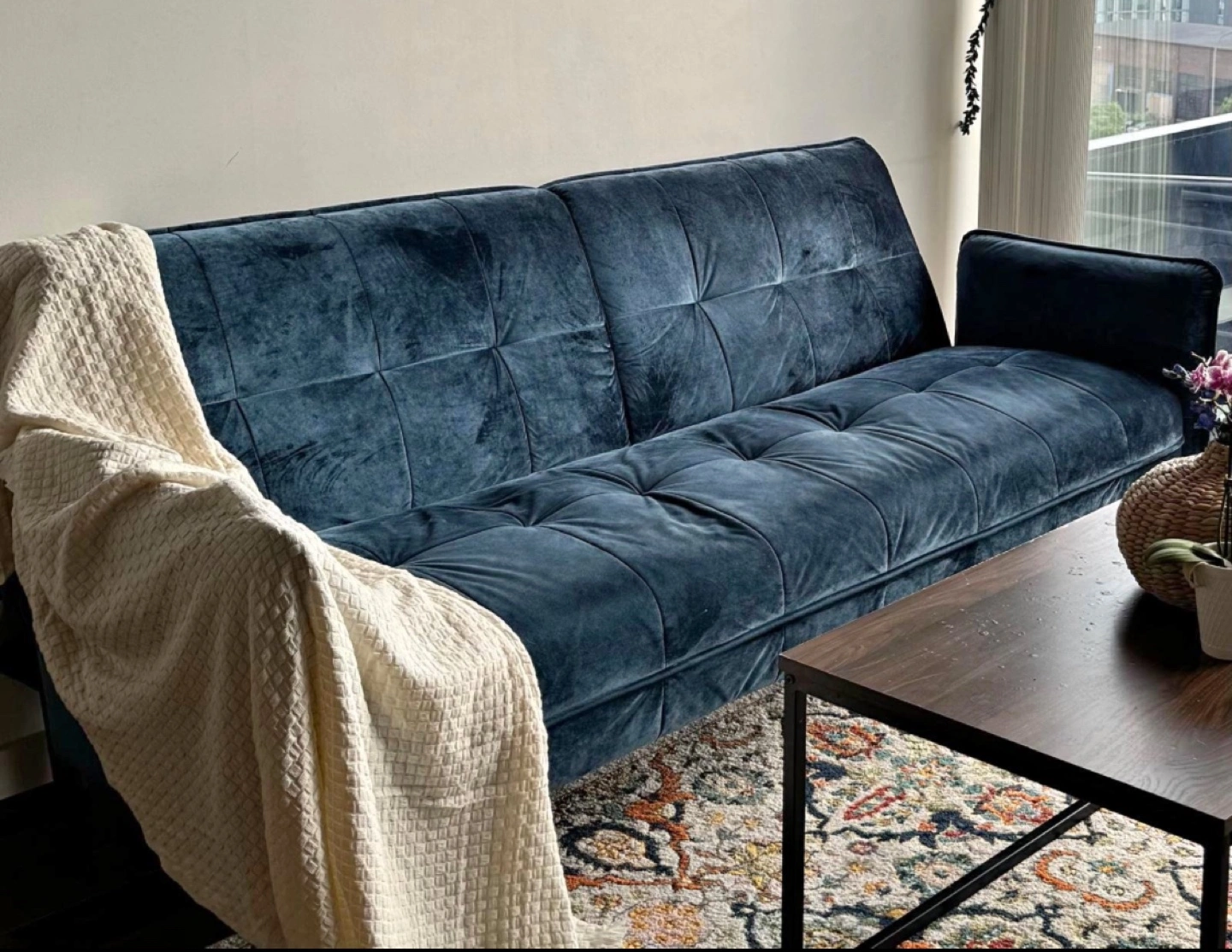 Sofa bed Deep teal velvet upholstery. Button-tufted design. Pull-out bed mechanism. Used but good condition with no tears, stains, etc... Getting a new one and need this gone. Originally $600