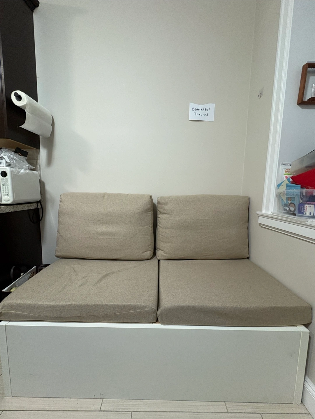 We made this a year ago with customized fitted foam, wooden board and covers on a 2x4 kallax. It’s one of a kind and we loved how it provided us extra easy to access storage while providing comfortable seating!