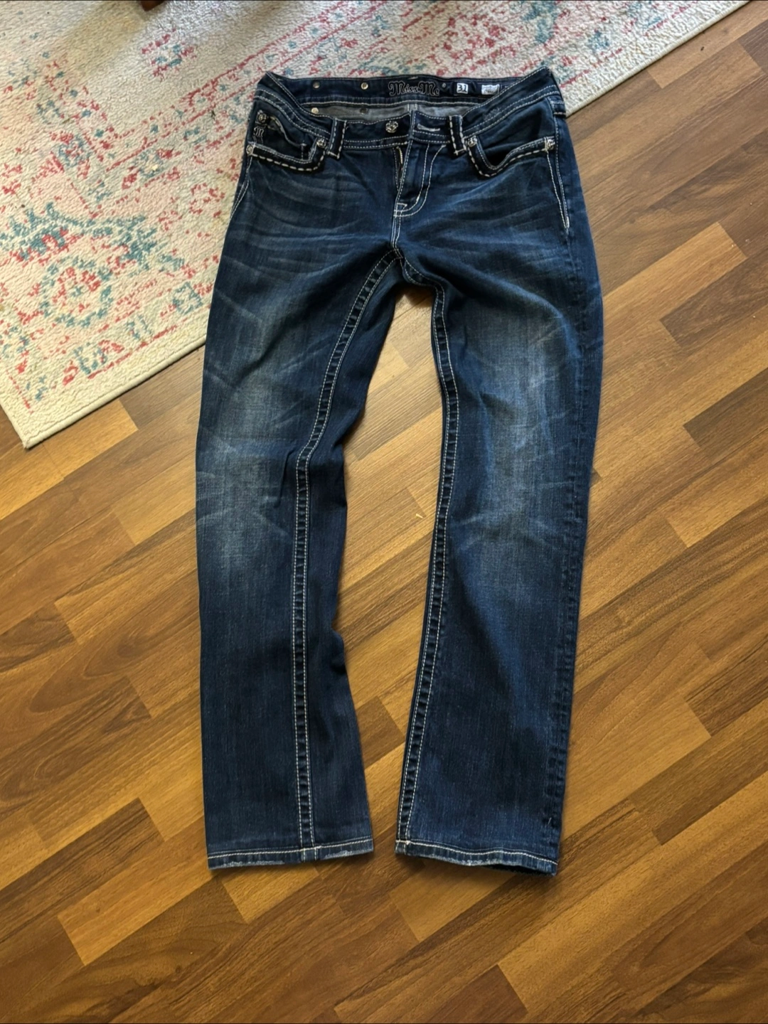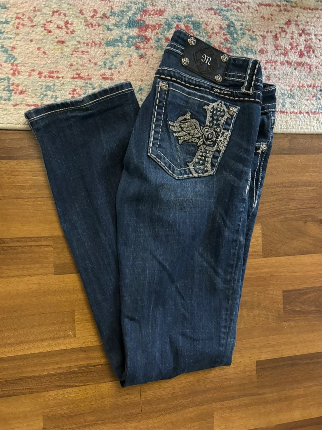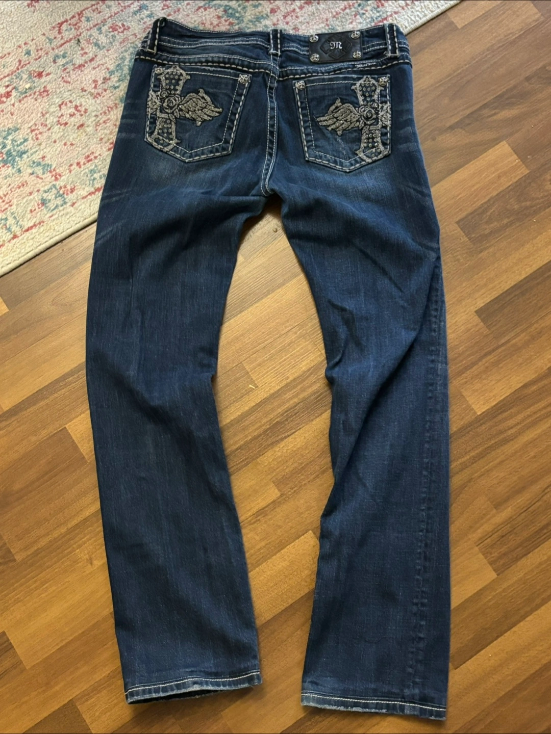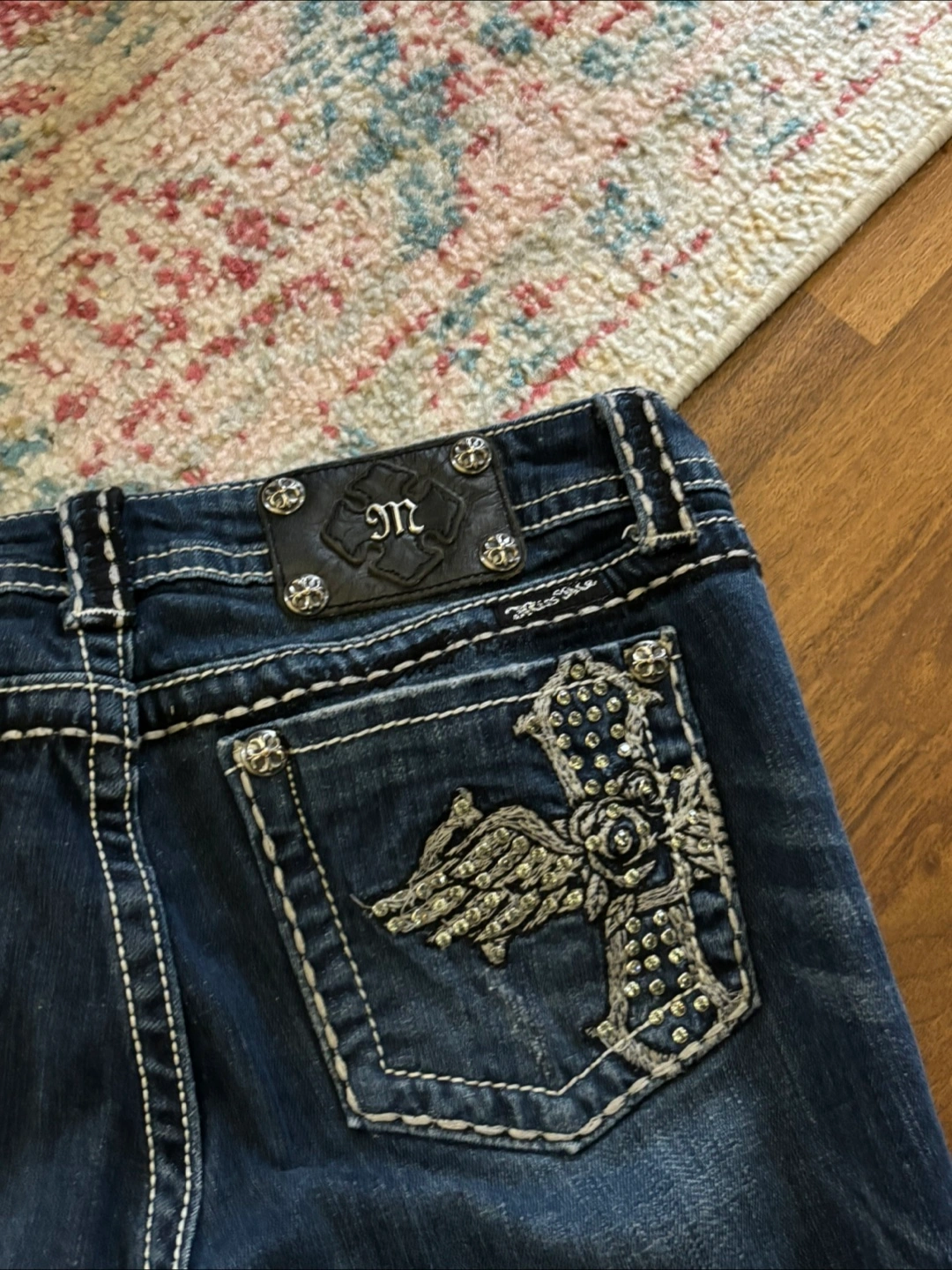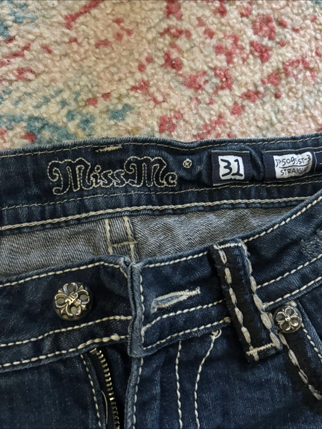 Dark wash Miss Me jeans. Size 31. Straight leg. Embellished back pockets. Excellent condition.