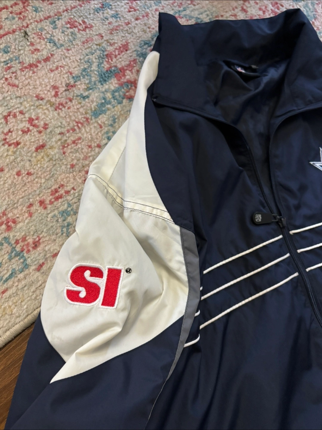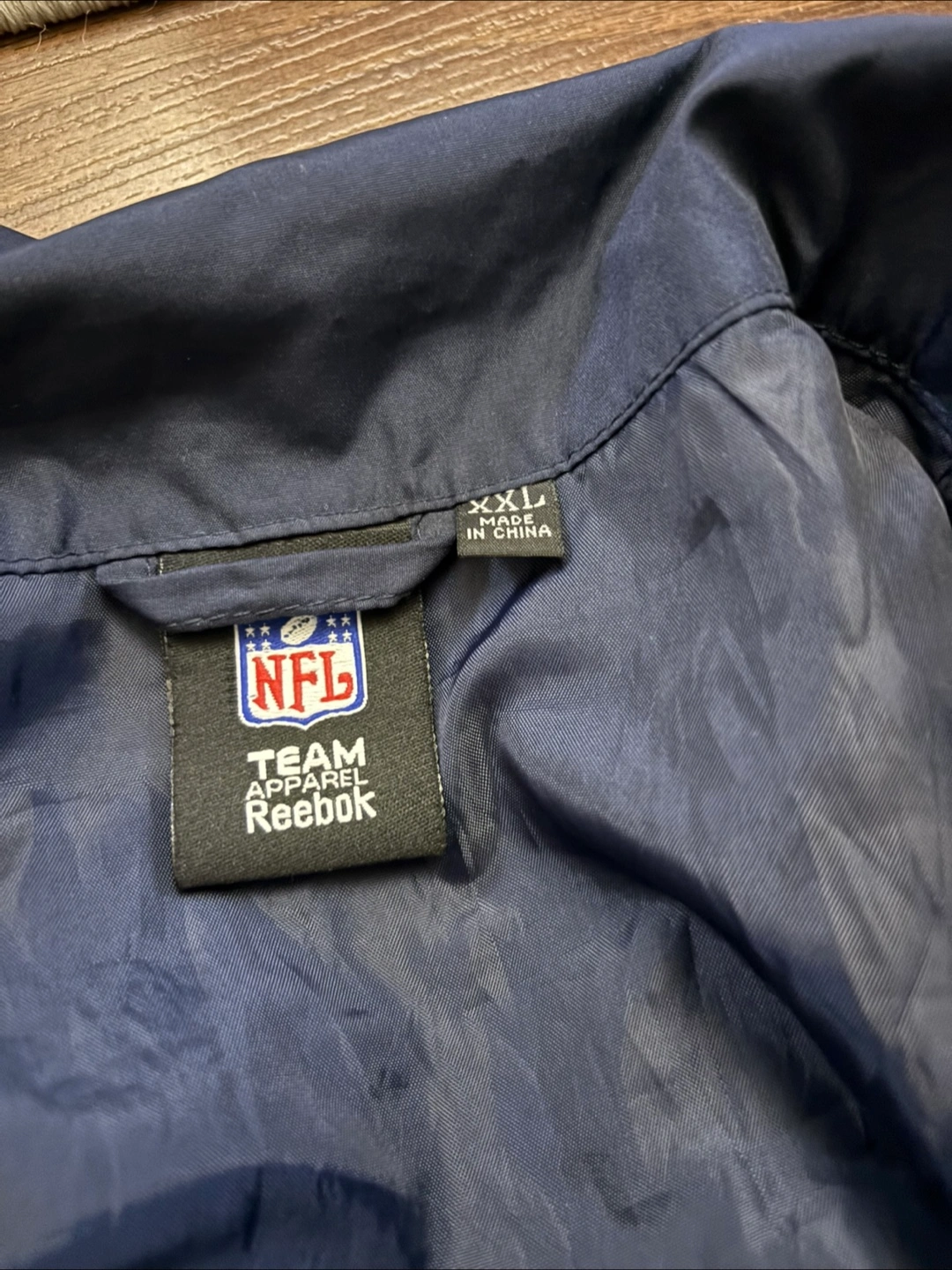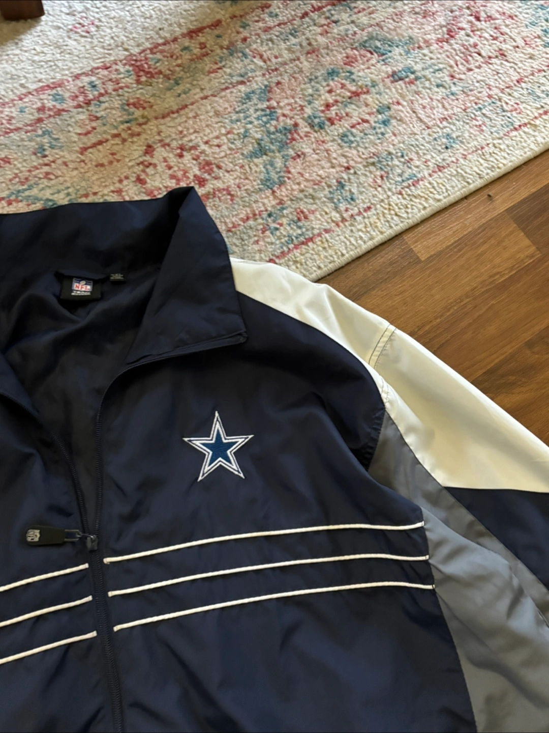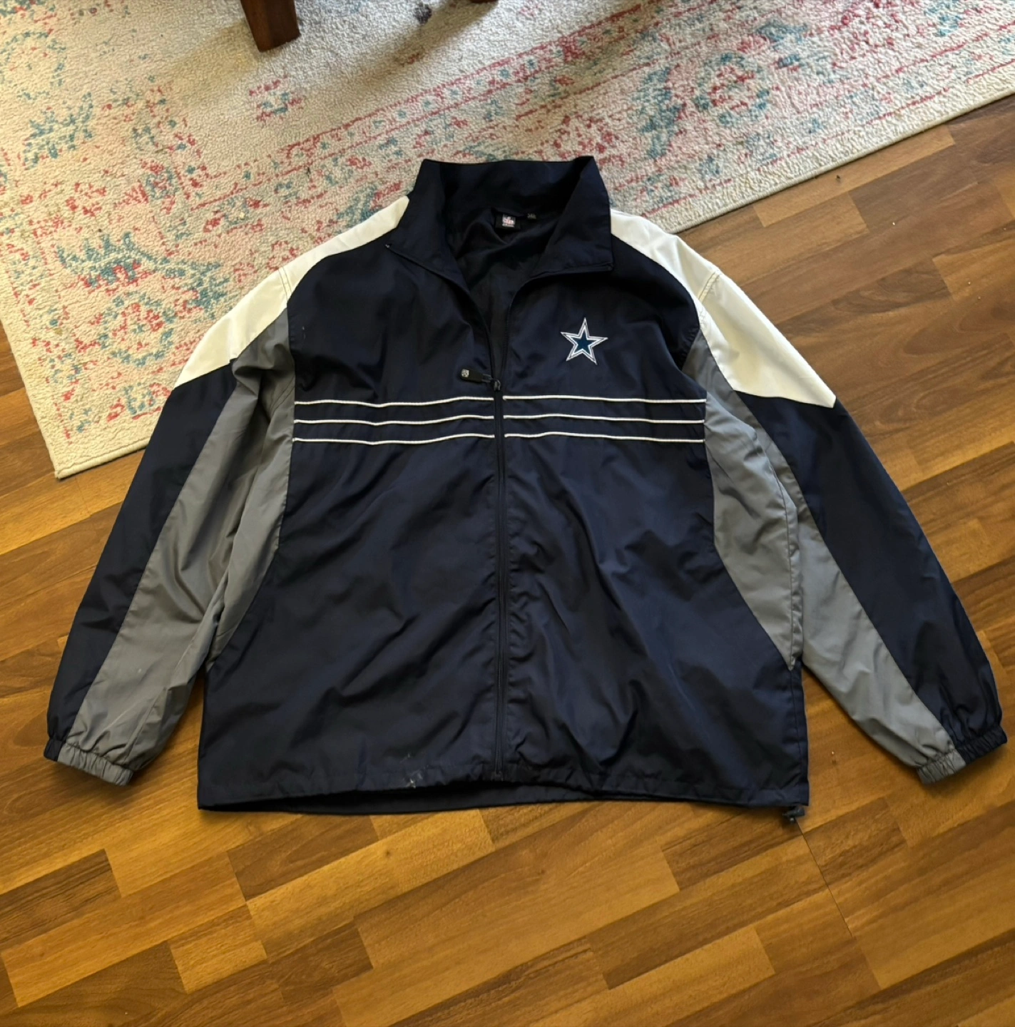 Men's Dallas Cowboys jacket. Size XXL. Reebok brand. Features a navy, grey, and white colour block design. Zip-up front. Embroidered Dallas Cowboys star logo. Long sleeves with elastic cuffs. Good condition. Made in China.