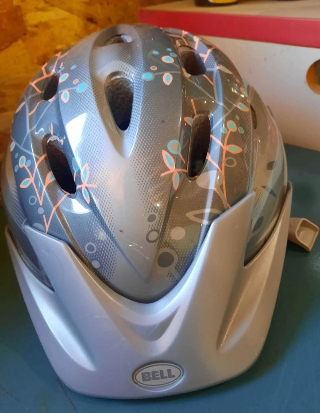 Used Bell Thalia youth bicycle helmet. Grey colour with a floral design. Size 54-57 cm. very good condition. This item is free because every child needs to be safe.