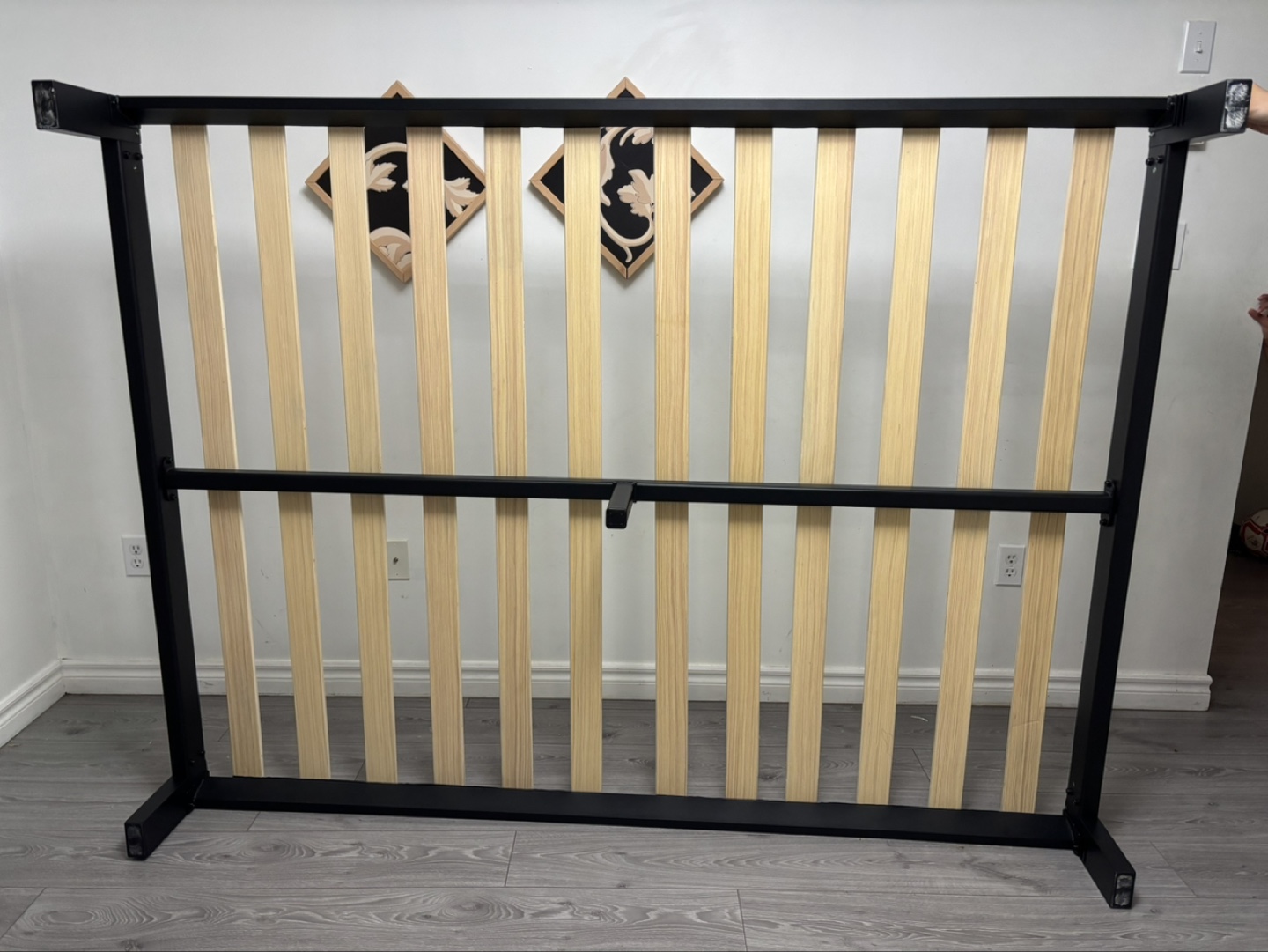 Sturdy queen platform bed frame. Black metal frame with light wood slats. Easy assembly. Minimalist design. Perfect for any bedroom.