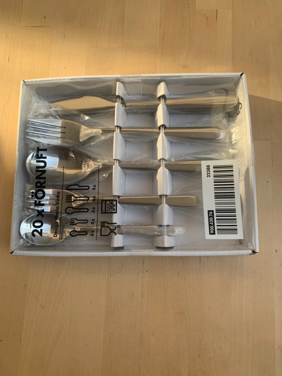 121New, unopened 20-piece stainless steel cutlery set. Includes four knives, four forks, four spoons, and eight teaspoons. Dishwasher safe.
