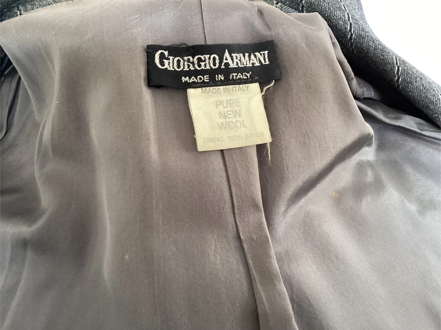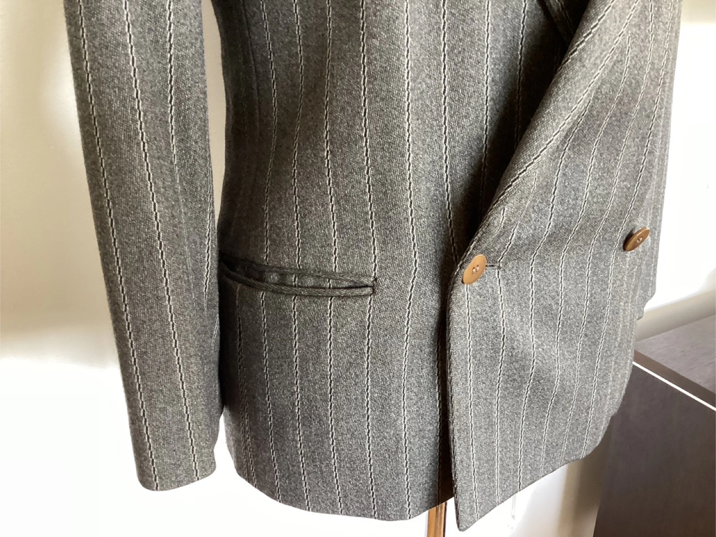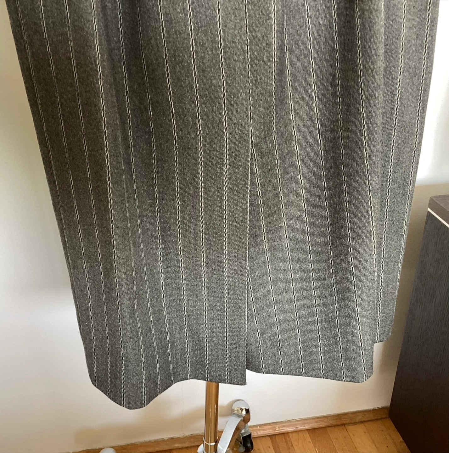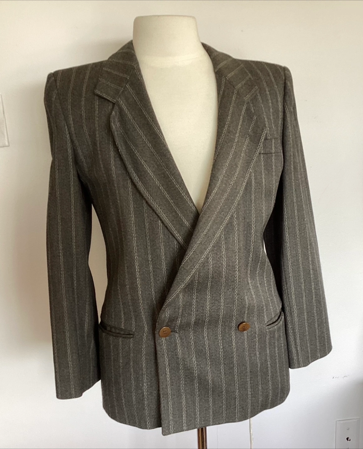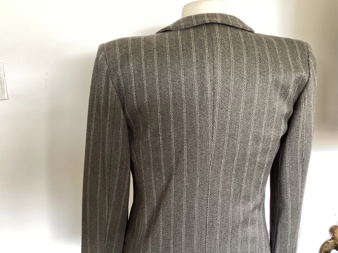 vintage Women's grey double breasted blazer and skirt. 1990's Pinstripe design. Pure wool. Made in Italy. Features a classic fit. size:44 Europe 100% Pure wool