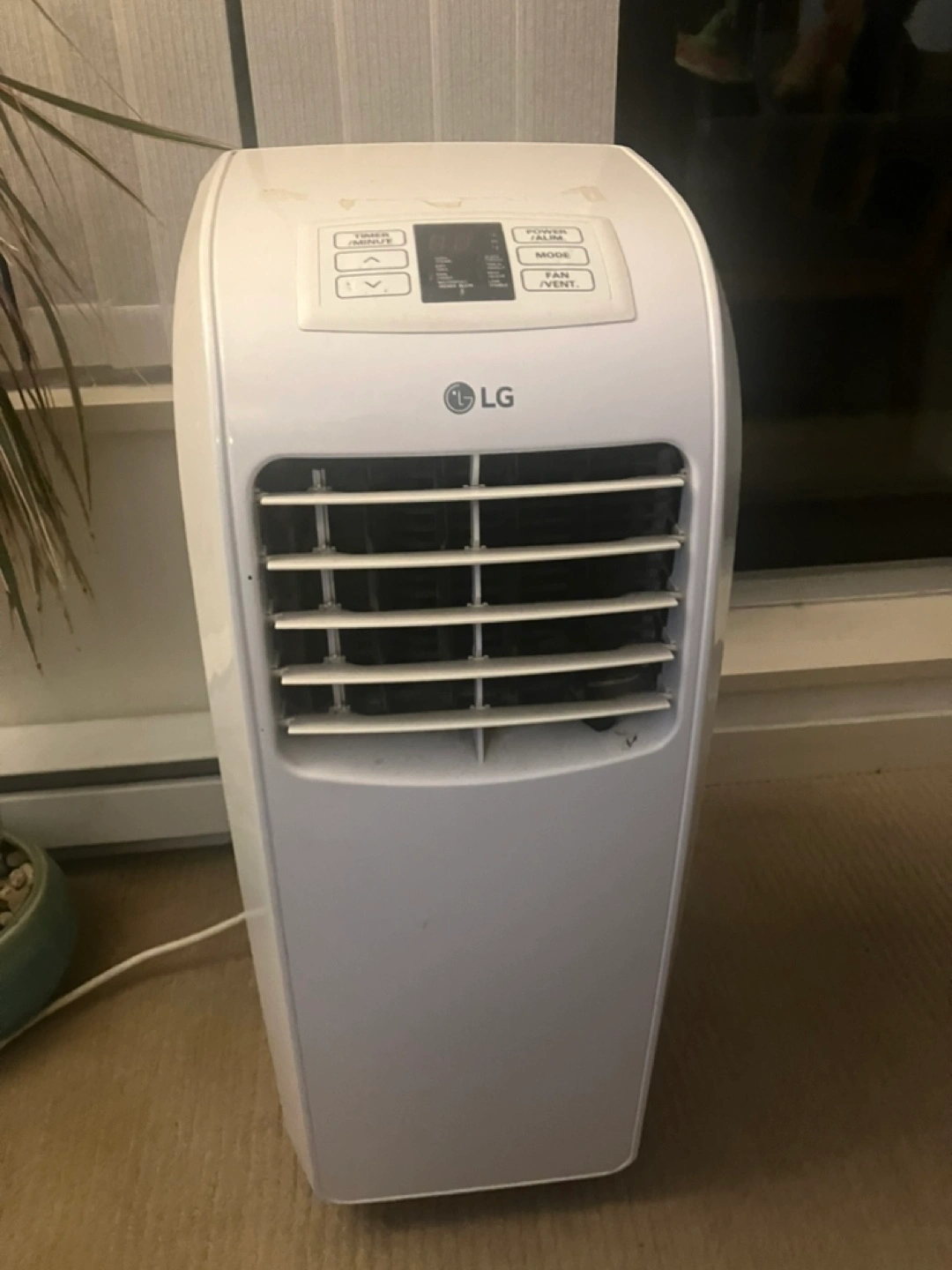 Portable air conditioner. Multiple settings including cool, fan, sleep, and timer. Some cosmetic damage to the top. Missing hose but the coupler is there.