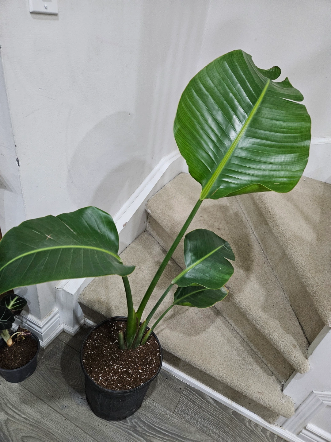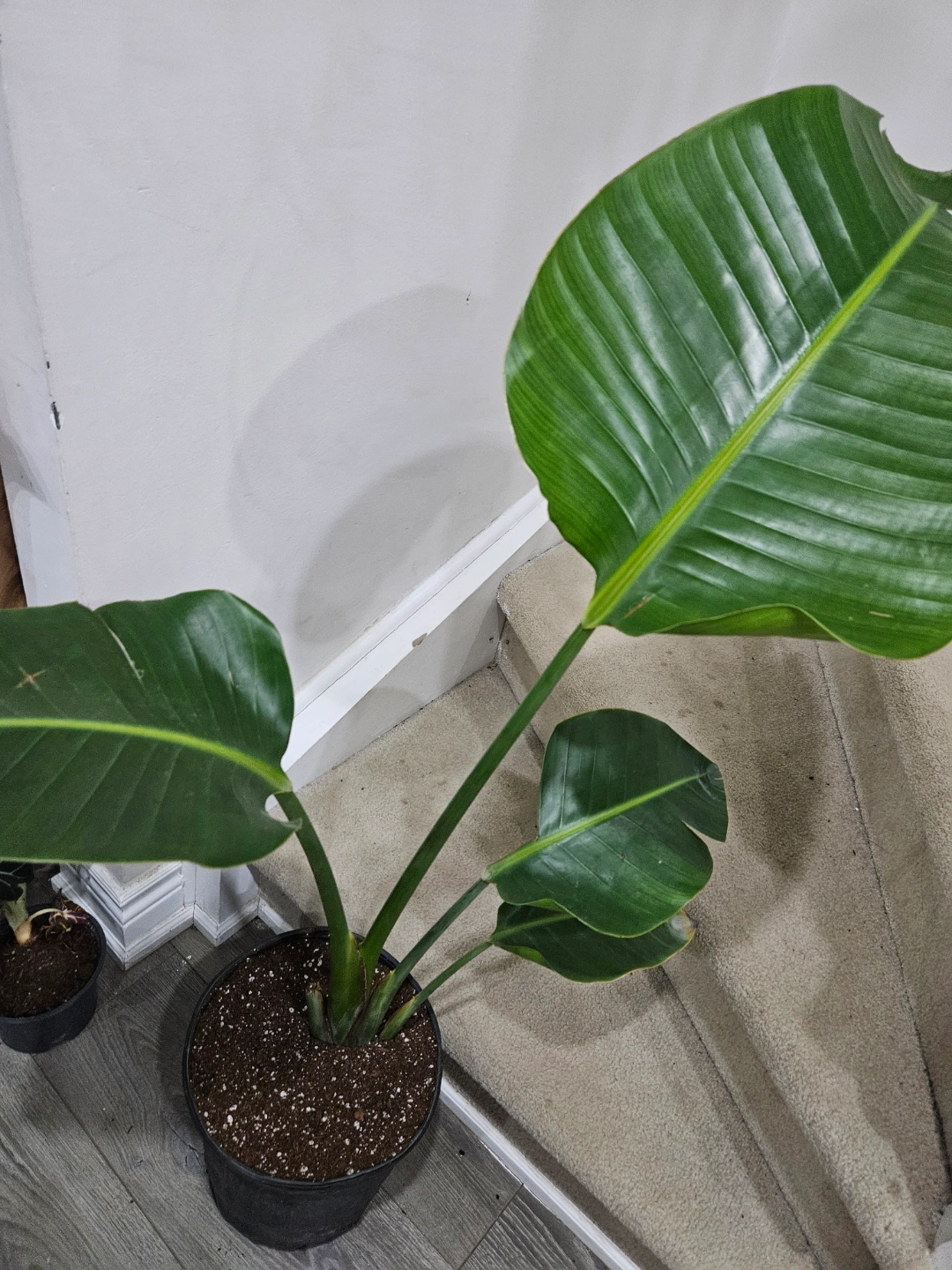 Healthy Bird of Paradise plant. Large leaves. Potted in black plastic container. Great addition to your home.
