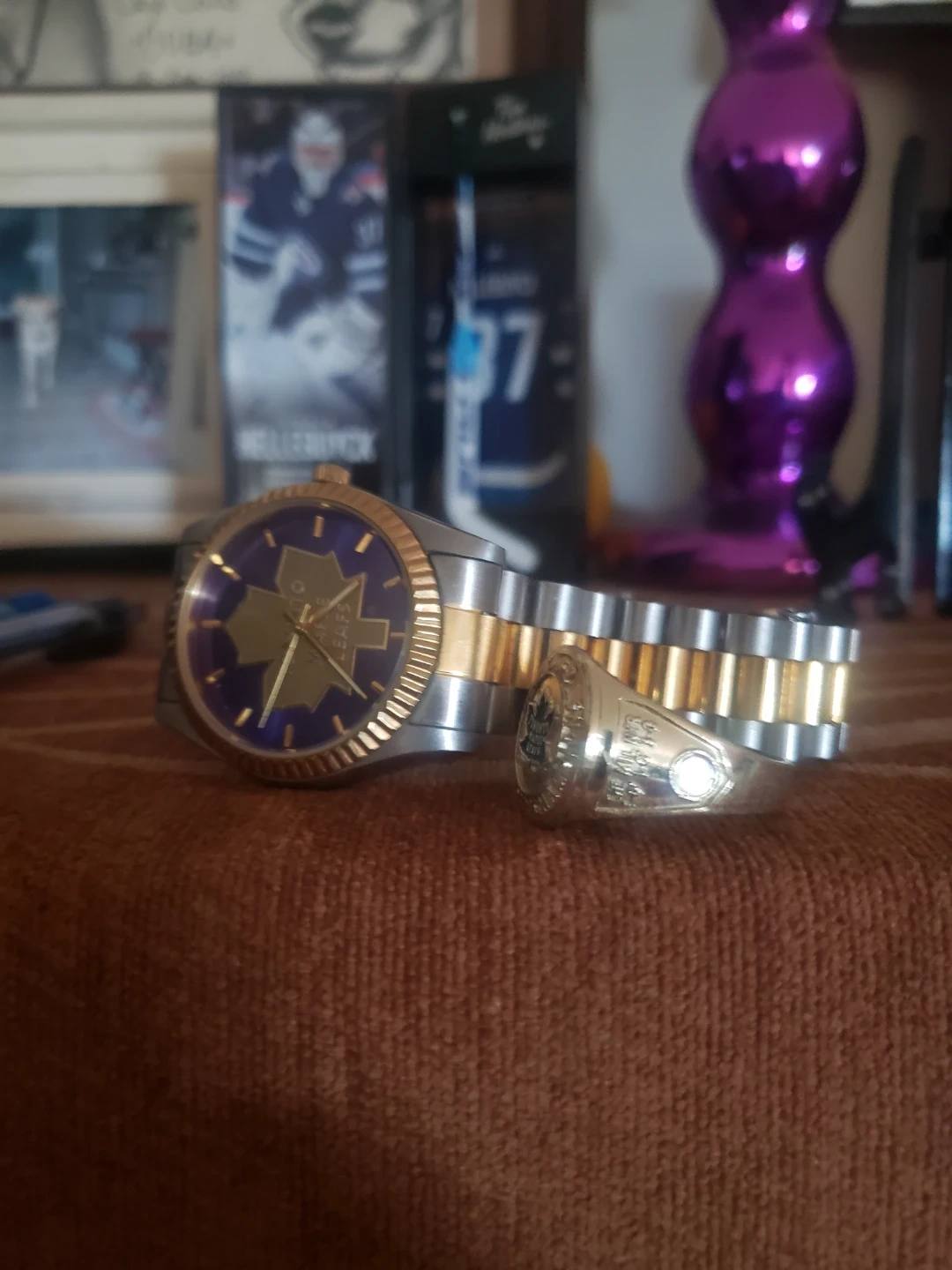 Two-piece Toronto Maple Leafs collectible set. Features a watch with a purple face and gold accents. Matching ring included. Excellent condition. Just needs a battery. Watch is Quartz . a product of the NHL. Today June 7 take both for only $15 cash !!! A Toronto maple leafs watch only $15 !!!! goes up tomorrow