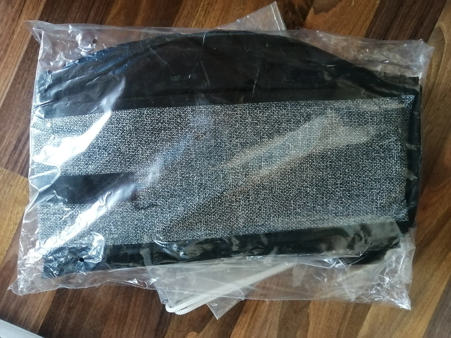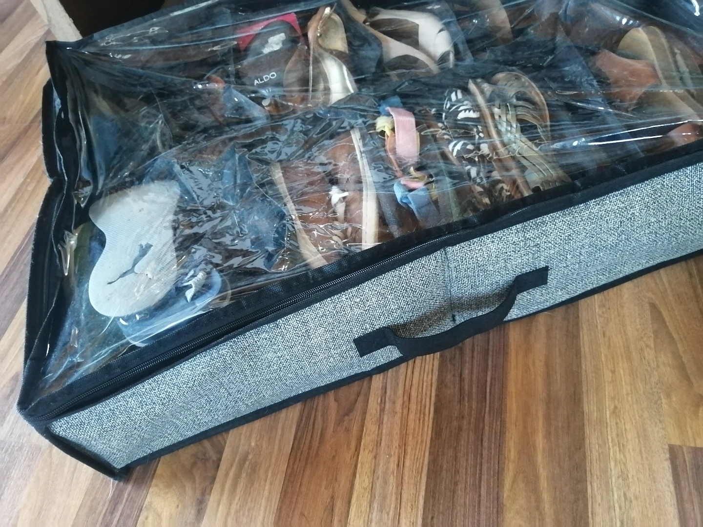 Brand new 12 pair shoe storage bag. great for underbed storage. Features a clear top for easy viewing and a convenient carrying handle. Black fabric with grey accents. Could easily fit more than 12 pairs depending on the shoe type.