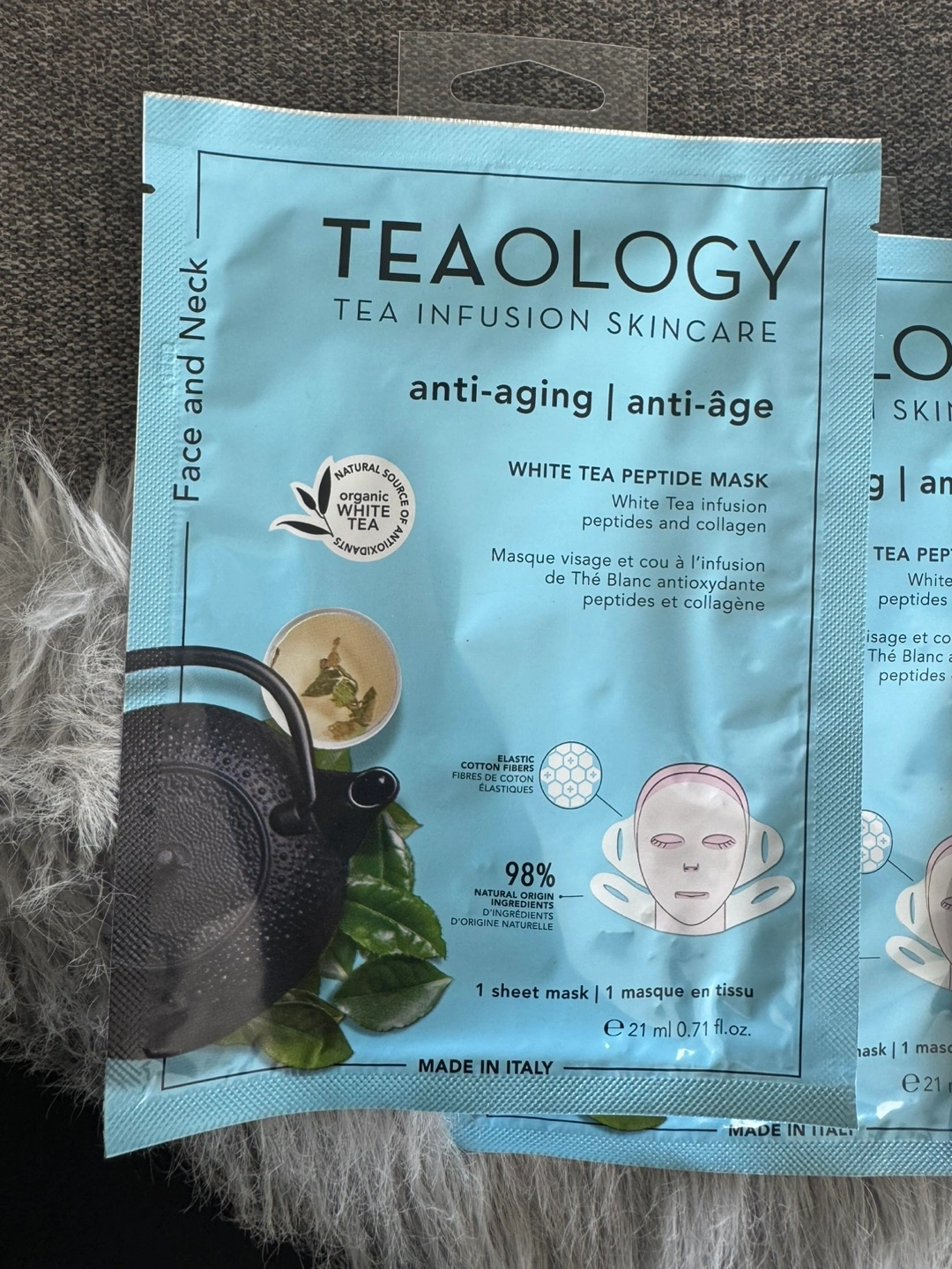 Single-use anti-aging face and neck mask. White tea infusion, peptides and collagen. Made in Italy. 21ml. $5 each or take all for $37
