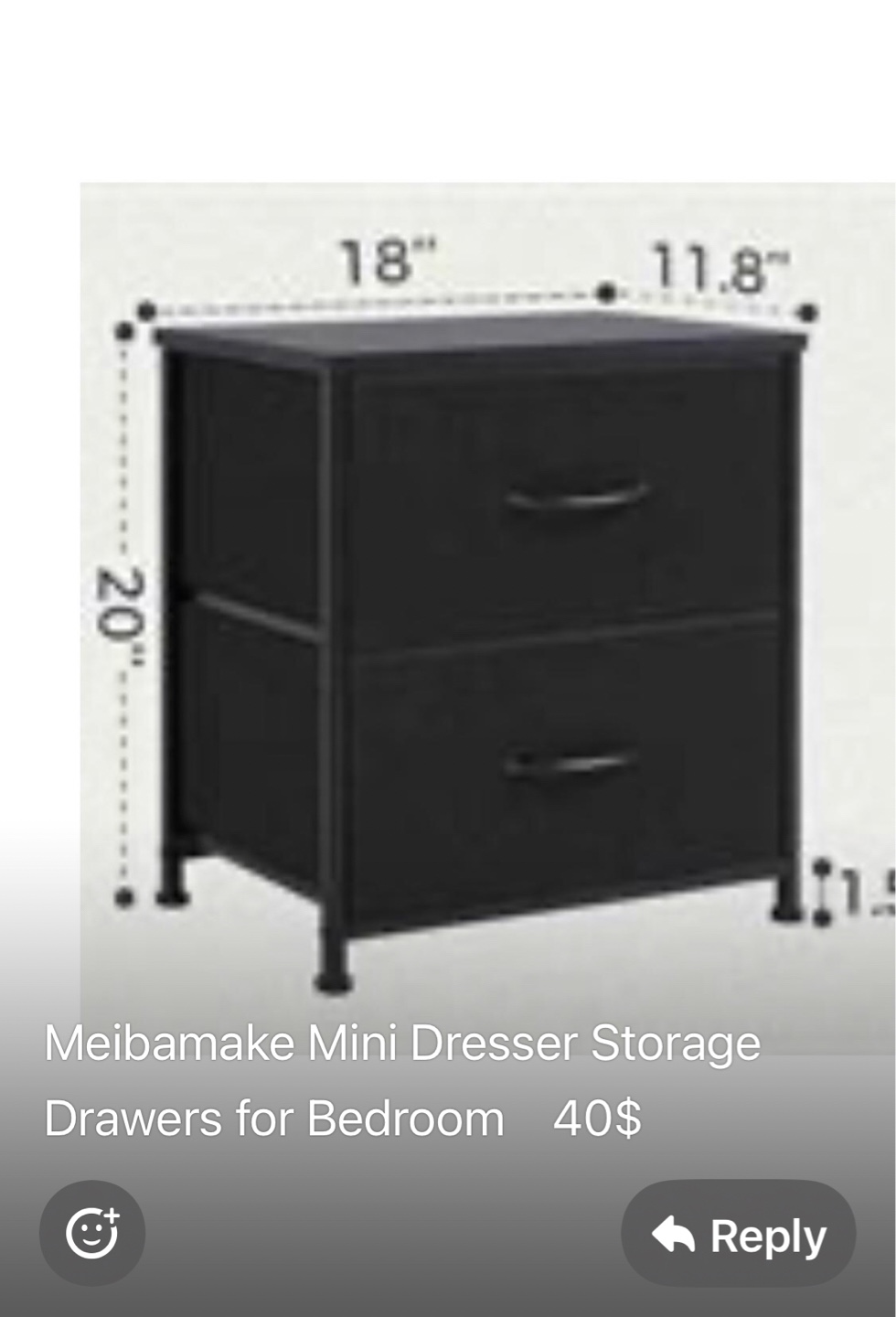 Black mini dresser. Two drawers. Metal frame. Great for bedroom storage. Dimensions shown in image.