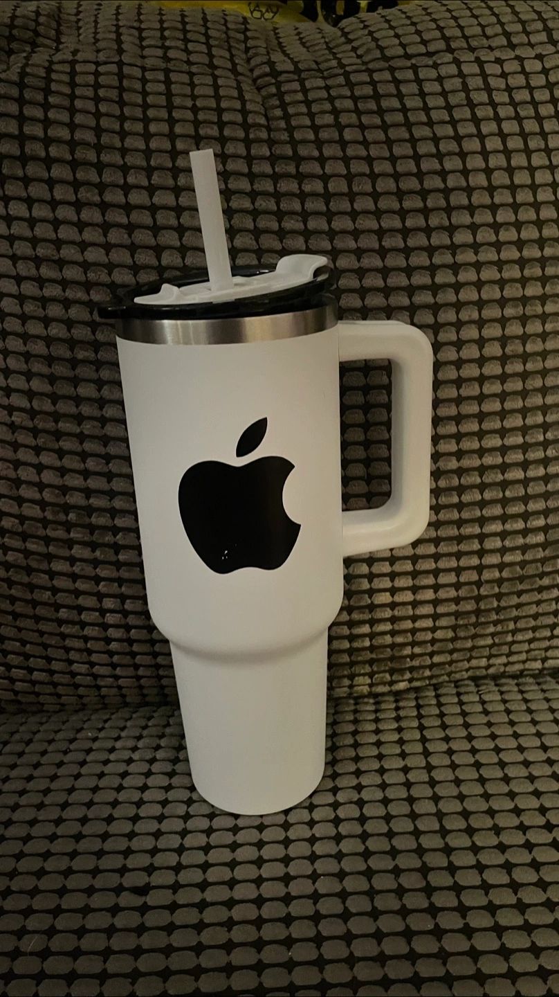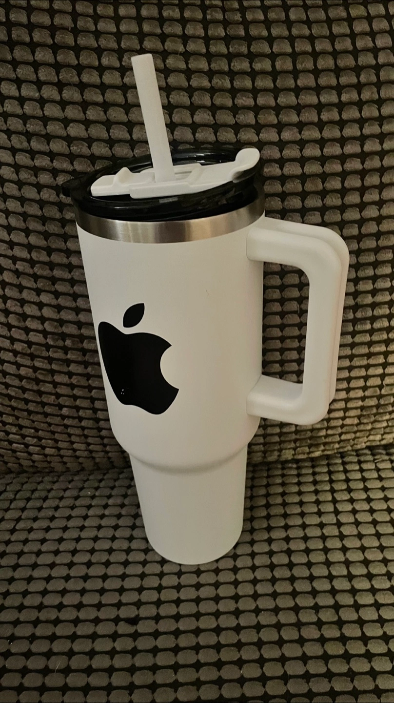 Large capacity travel mug. Features a white exterior, stainless steel interior, black Apple logo, and a comfortable handle. Includes a lid with a straw.