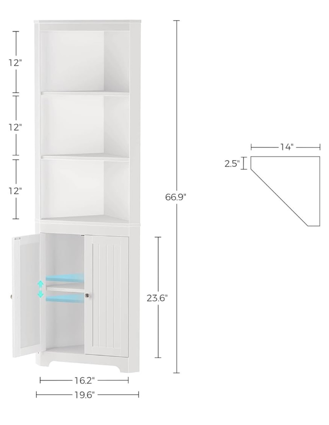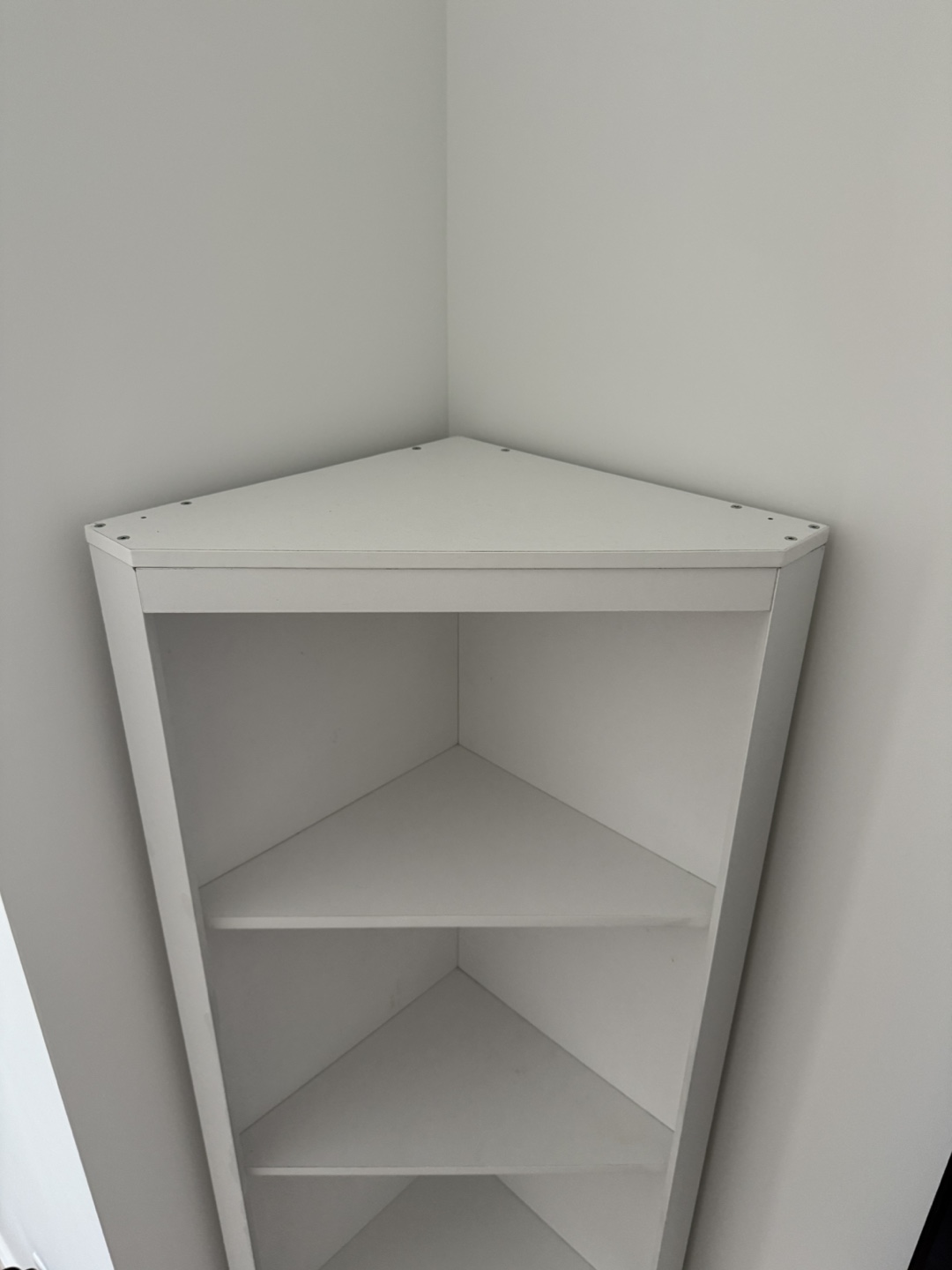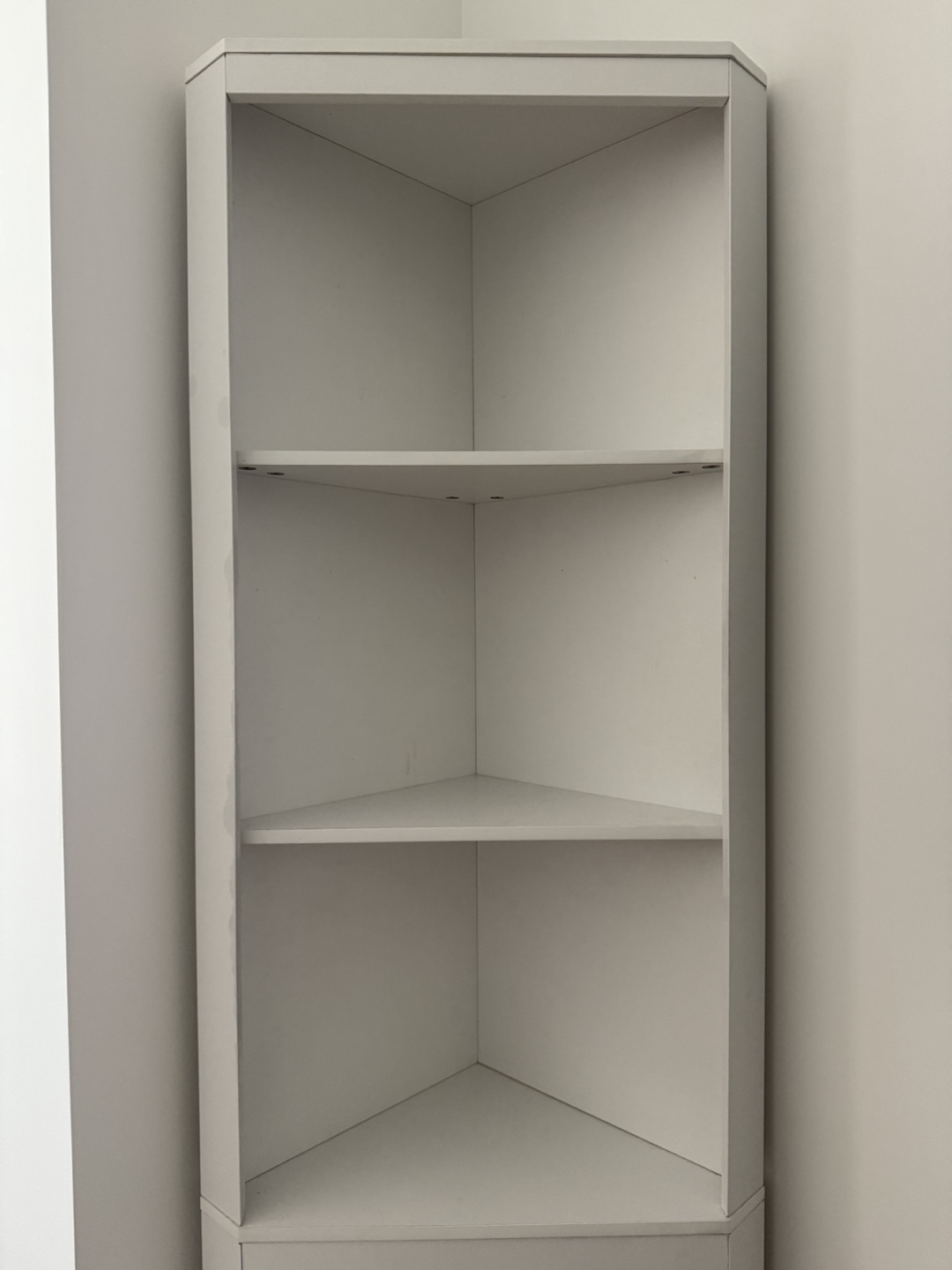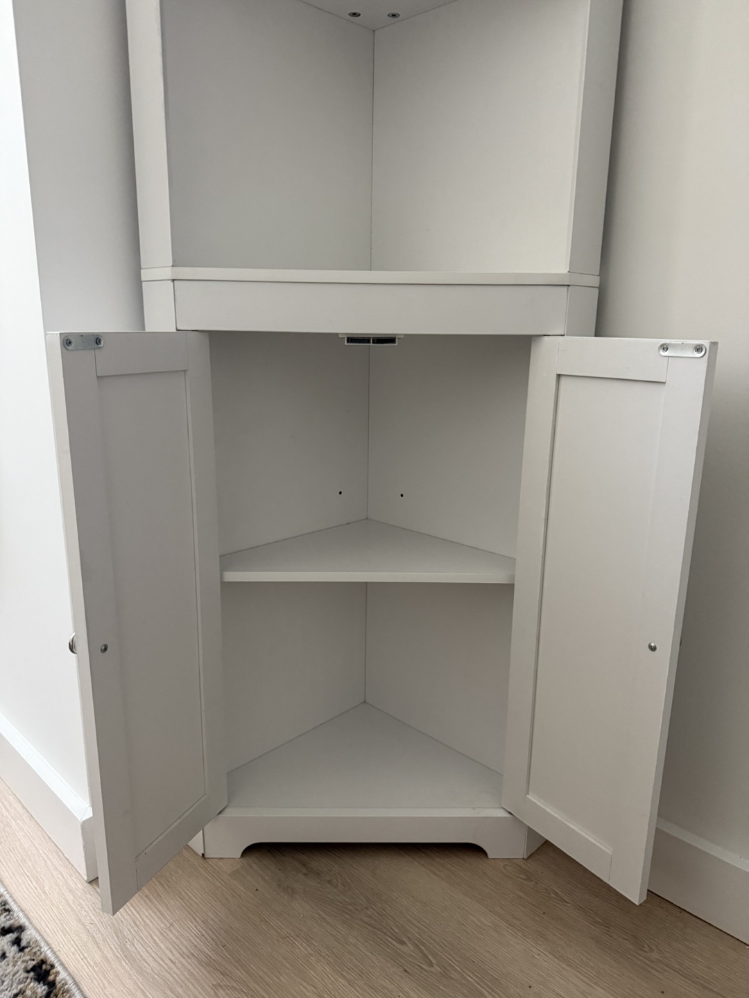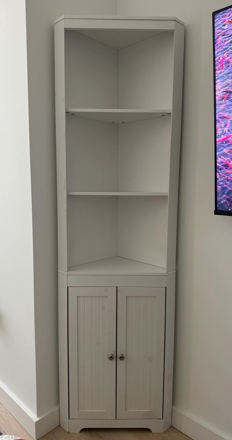 Corner cabinet, three shelves, two doors, storage, white finish. Perfect for small spaces. Good condition.