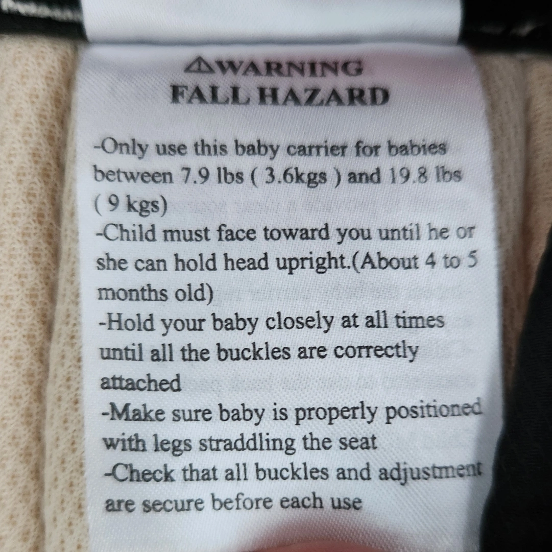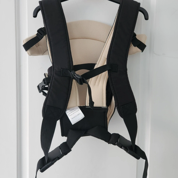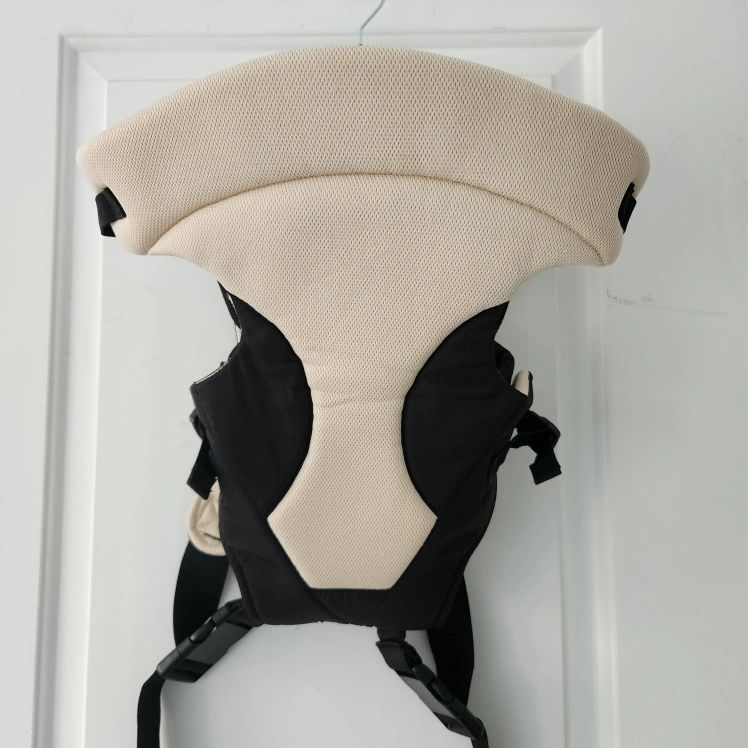 Infant baby carrier. Black and beige color scheme. Adjustable straps. Suitable for babies between 7.9 and 19.8 lbs.