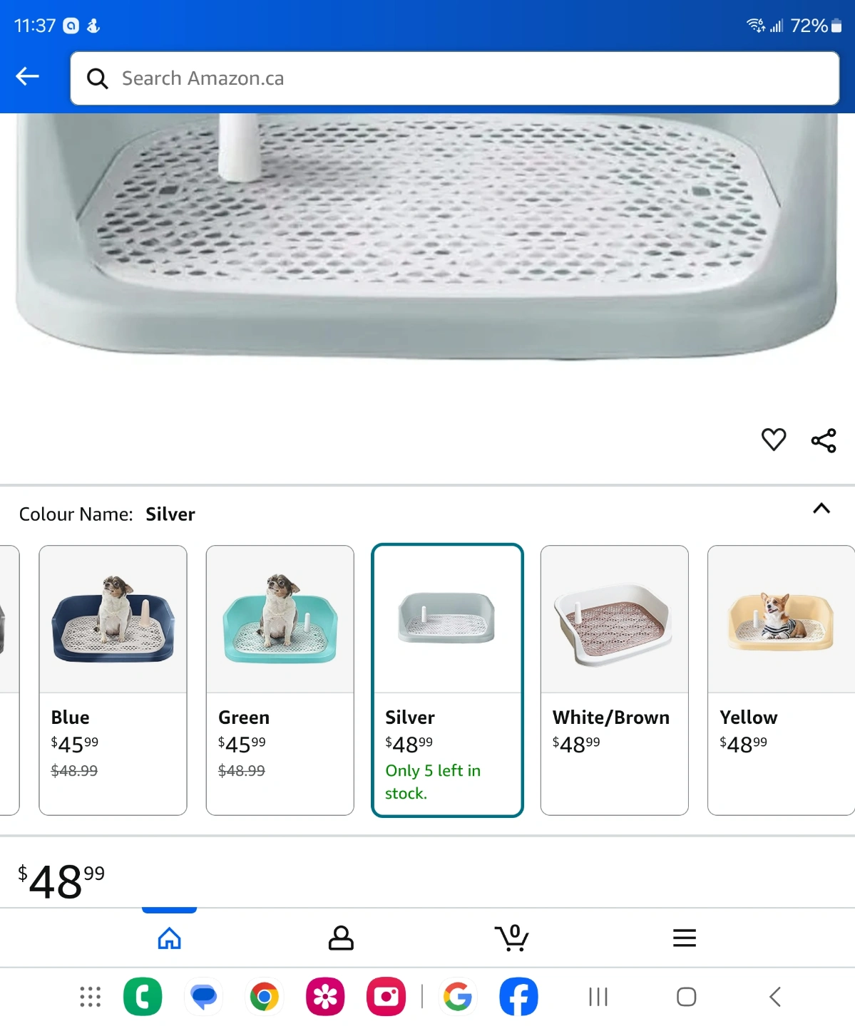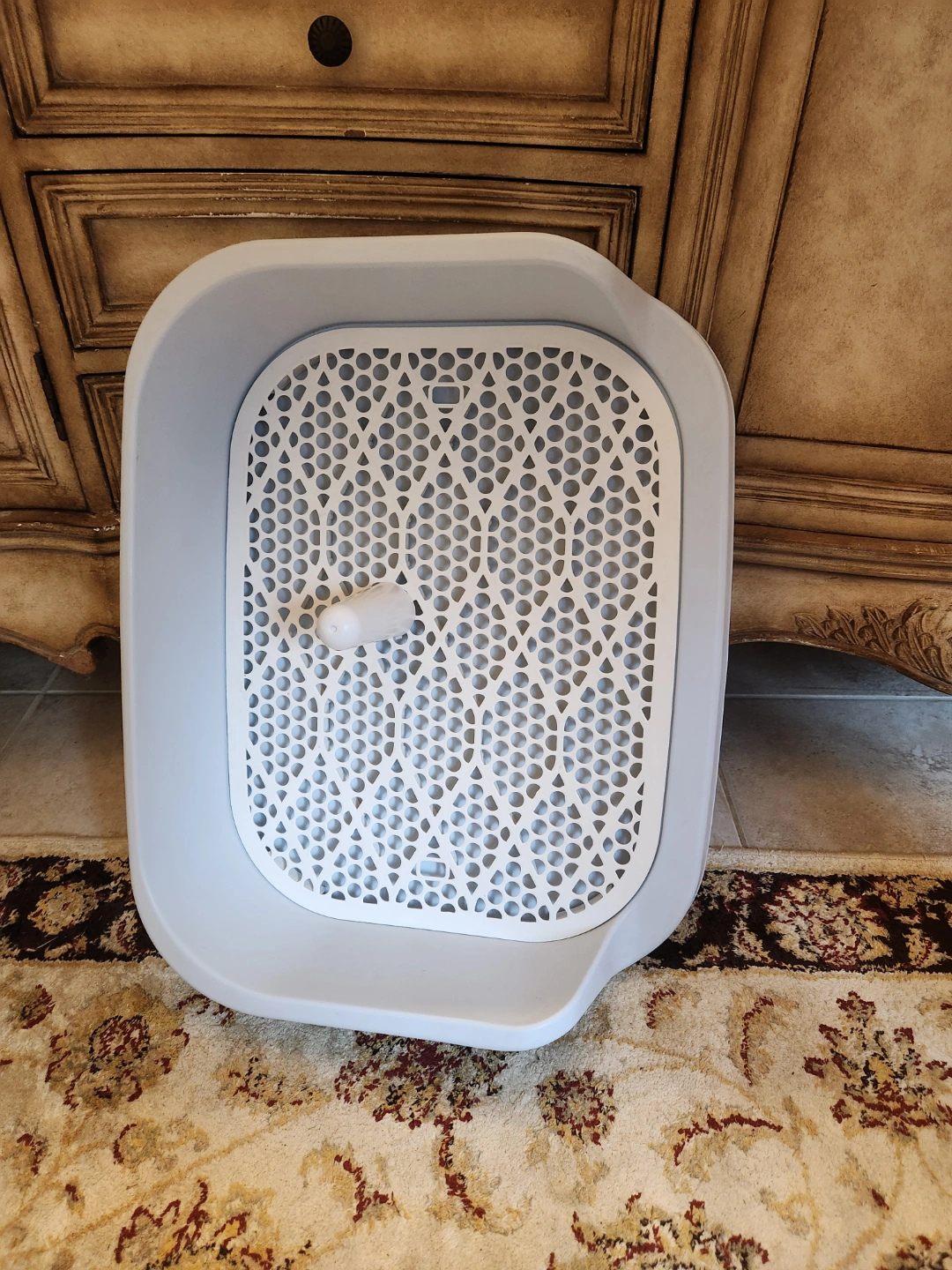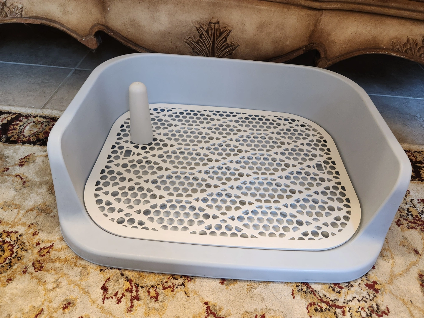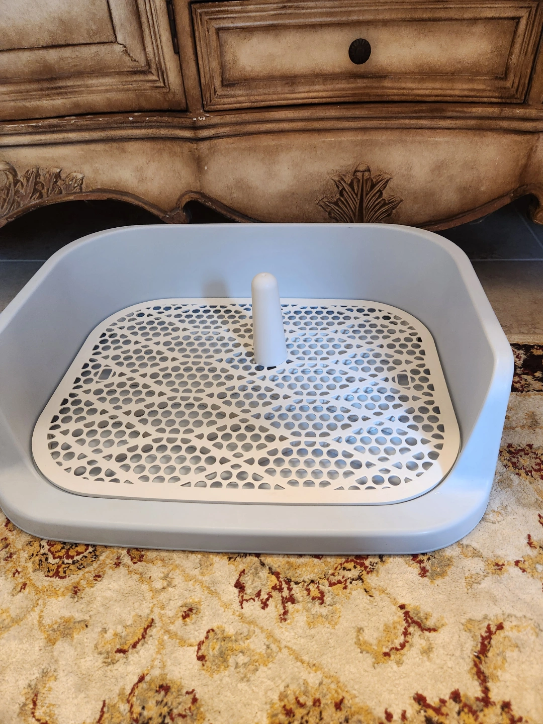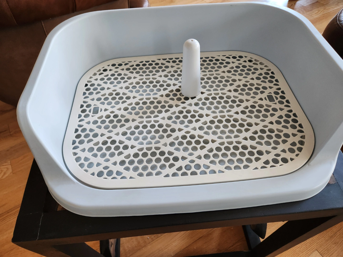 New potty training system. Includes a plastic tray with a perforated insert and a small removable post. Easy to clean. Perfect for dogs (males ) to use the toilet. If you have a female dog , just remove the post. Large size.